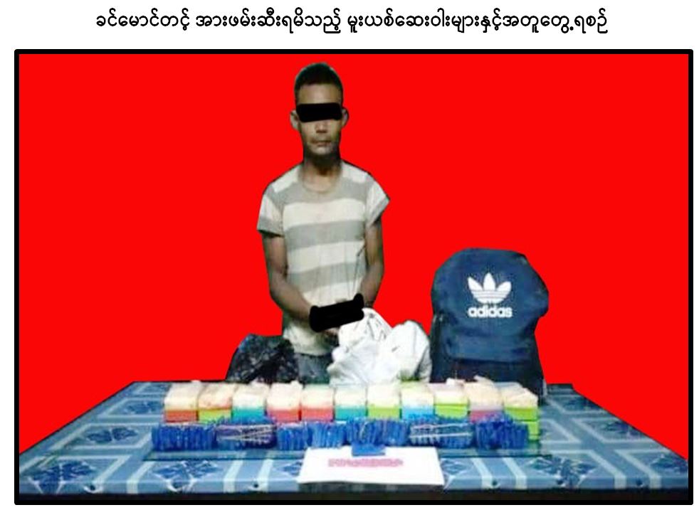 အလားတူ ဇွန် ၆ ရက် ညပိုင်းက စင်းခန်းနယ်မြေရဲစခန်းမှ တပ်ဖွဲ့ဝင်များသည် ဗန်းမော်မြို့နယ်၊ စင်းခန်းကျေးရွာအုပ်စု၊ စင်းခန်းကျေးရွာ၊ စင်းခန်းတံတားလုံခြုံရေးရဲကင်းရှေ့တွင် ခင်မောင်တင့် မောင်းနှင်လာသော မော်တော်ဆိုင်ကယ်ကို ရပ်တန့်ရှာဖွေရာ ဘိန်းဖြူ သုည ဒသမ ၄၄ ကီလိုနှင့် စိတ်ကြွရူးသွပ်ဆေးပြား ၁၁,၄၀၀ ကိုလည်းကောင်း။