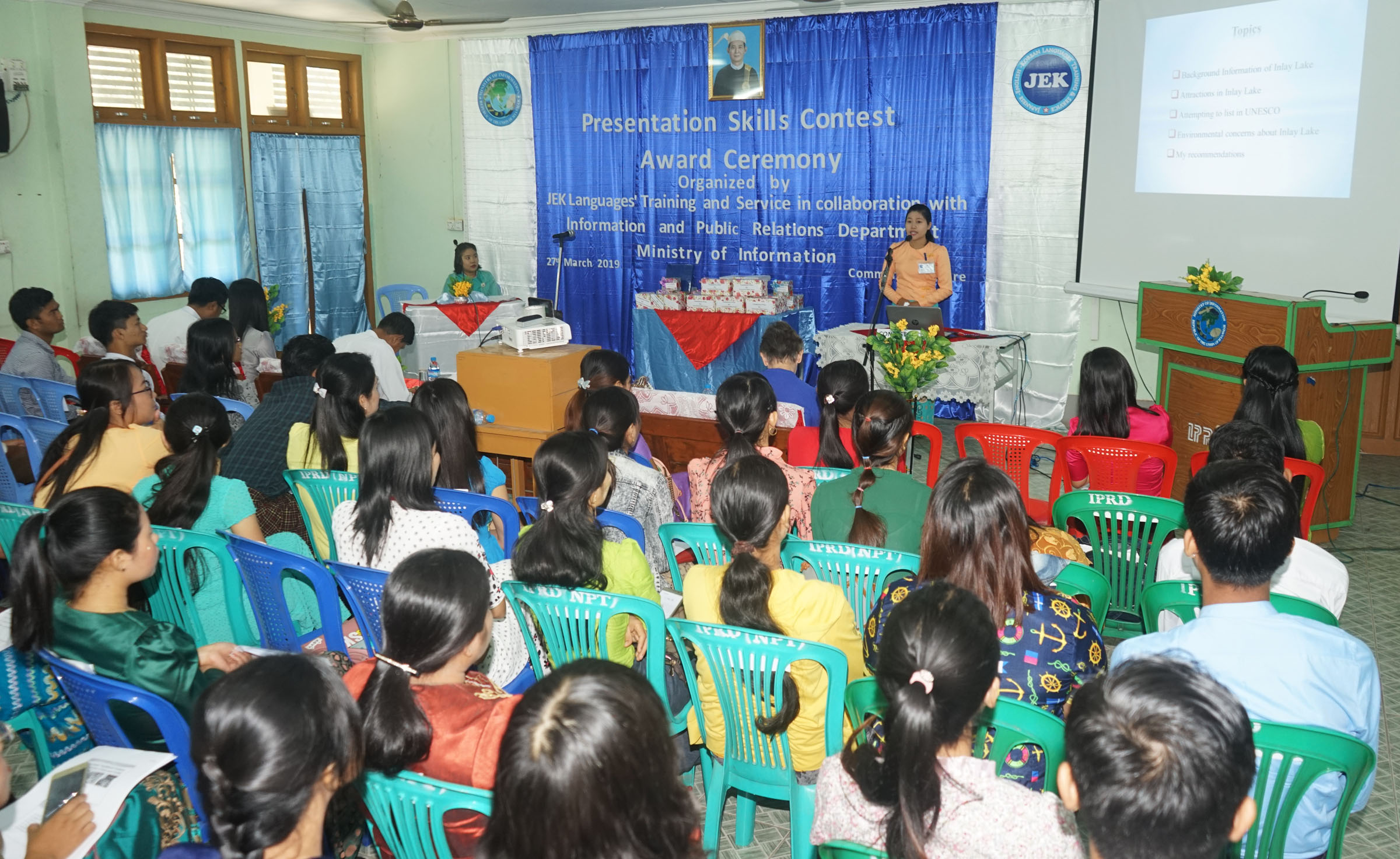 ယင်းနောက် JEK ပညာဒါနသင်တန်းတွင် အင်္ဂလိပ်ဘာသာစကား သင်ကြားလျှက်ရှိသည့် သင်တန်းသား၊ သင်တန်းသူ ၅၀ က တစ်အုပ်စုလျှင်(၅)ဦးနှုန်းဖြင့် အင်္ဂလိပ်ဘာသာ စကားပြော စွမ်းရည် ဝင်ရောက်ယှဉ်ပြိုင်ကြရာ ပြိုင်ပွဲတွင် ဆုရရှိသူများ နေပြည်တော် ပြန်ကြားရေးနှင့် ပြည်သူ့ဆက်ဆံရေးဦးစီးဌာန ဒုတိယညွှန်ကြားရေးမှူးနှင့် တာဝန်ရှိသူများက ဆုများအသီးသီး ပေးအပ်ချီးမြှင့် သည်။