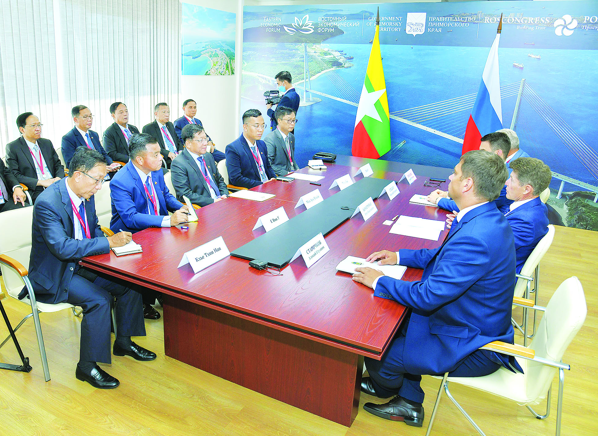 ဦးစွာ နိုင်ငံတော်စီမံအုပ်ချုပ်ရေးကောင်စီဥက္ကဋ္ဌ နိုင်ငံတော်ဝန်ကြီးချုပ်သည် Primorsky ဒေသအစိုးရ အဖွဲ့အကြီး အကဲနှင့် တွေ့ဆုံခဲ့ပြီး အဆိုပါ တွေ့ဆုံ ဆွေးနွေးပွဲသို့ နိုင်ငံတော်စီမံအုပ်ချုပ်ရေးကောင်စီ ဥက္ကဋ္ဌ နိုင်ငံတော် ဝန်ကြီးချုပ်နှင့်အတူ ကောင်စီတွဲဖက်အတွင်းရေးမှူး ဒုတိယဗိုလ်ချုပ်ကြီး ရဲဝင်းဦး၊ ခရီးစဉ်တွင်လိုက်ပါလာ သည့် ပြည်ထောင်စုဝန်ကြီး များ၊ ကာကွယ်ရေးဦးစီးချုပ်ရုံးမှ တပ်မတော်အရာရှိကြီးများ၊ ဒုတိယဝန်ကြီးများ၊ ရုရှားနိုင်ငံဆိုင်ရာ မြန်မာနိုင်ငံသံအမတ်ကြီး ဦးလွင်ဦးနှင့် မြန်မာစစ်သံ (ကြည်း၊ ရေ၊ လေ) ဗိုလ်မှူးချုပ် မိုးကျော်တို့ တက်ရောက်ကြပြီး Primorsky ဒေသအစိုးရအဖွဲ့ အကြီးအကဲနှင့်အတူ ဒေသအစိုးရအဖွဲ့မှ တာဝန်ရှိသူ များ တက်ရောက်ကြသည်။