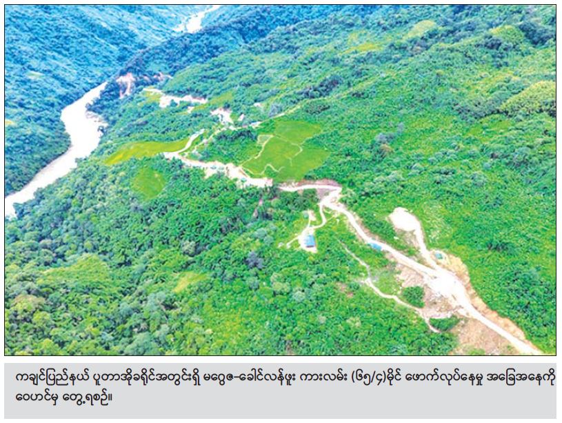 အခုစီမံကိန်းလုပ်ငန်းအပိုင်း(၄)ကို ရောက်နေပါပြီ။ ဆောင်ရွက်ပြီးသမျှ လုပ်ငန်းတွေကတော့ လာမည့်နှစ်မှာ မြေလမ်းအနေနဲ့ ပြီးသလောက်ဖြစ်သွားမယ်။ ကျောက် လမ်းက (၄၄/၀)မိုင်အထိ လျာထားပါတယ်။ သည်လမ်းကြီးပေါ်မှာ ကွန်ကရစ်တံတား အစင်း ၂၀၊ Box Culvert ၁၅၂ စင်း၊ ကျောက်စီရေမြောင်း ၁၃၉၉၅ ပေ၊ ကွန်ကရစ် ရေကျော် နှစ်ခု၊ ကွန်ကရစ် ရေပြွန်နှစ်ခု ဆောင်ရွက်ထား ပြီးဖြစ်ပါတယ်။ ကျွန်တော်တို့ ဝန်ကြီးဌာနအနေနဲ့ သည်ကားလမ်းကြီးကို ဖောက်လုပ်ပေးခဲ့တဲ့နေရာမှာ မိမိ ဝန်ထမ်းများ၊ တပ်မတော်သားများ၊ ဌာနပိုင် ယာဉ်/ ယန္တရားများနှင့်အတူ ခွဲဝေရရှိသော ဝန်ကြီးဌာန ဘတ်ဂျက် ရန်ပုံငွေကိုသာ အသုံးပြုပြီး ကျေးလက်လမ်း အဆင့်ထက် အနည်းငယ်သာလွန်ကောင်းမွန်တဲ့ လမ်း တစ်လမ်းဖြစ်အောင် အကောင်အထည်ဖော် ဆောင်ရွက် ပေးနေခြင်းဖြစ်ပါတယ်။ မဂ္ဂဇ-ခေါင်လန်ဖူး ကားလမ်းကြီးပေါက်သွားပြီဆိုရင်တော့ လမ်းပန်းဆက်သွယ်ရေး ခက်ခဲတဲ့ မြောက်ဘက်က ရှိန်းခေါင်ဒေသနဲ့ နယ်စပ်ရေးရာဝန်ကြီးဌာနရဲ့ နယ်စပ်ပတ်လမ်း စီမံကိန်းမှာ ပါဝင်နေတဲ့ တောင်ဘက်က လန်ဆယ်ဒေသများအထိ လမ်းများ ဆက်လက် ဖောက်လုပ်ပေးဖို့ လျာထားပြီးဖြစ်ပါတယ်။ လုပ်ငန်းခွင်အတွက် စက်ယန္တရားကြီးများလည်း အသင့် ရှိနေပြီ ဖြစ်ပါတယ်..” ဟု ၎င်းကပြောသည်။
