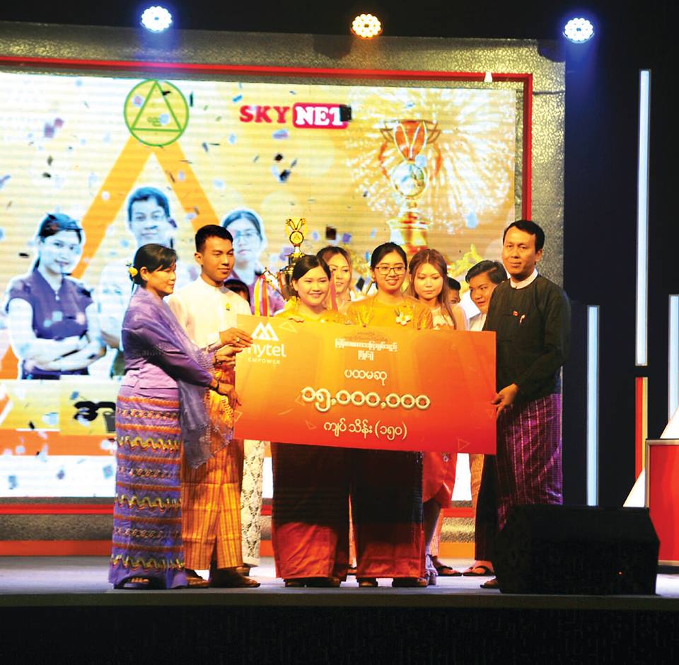 ပညာရေးဝန်ကြီးဌာန Mytel နှင့် Skynet တို့ ပူးပေါင်းကျင်းပခဲ့သည့် အဆိုပါ ပထမအကြိမ် တက္ကသိုလ်၊ ကောလိပ်ပေါင်းစုံ မြန်မာစကားပြော စွမ်းရည်ပြိုင်ပွဲတွင် ဗိုလ်စွဲခဲ့သည့် ရန်ကုန်တက္ကသိုလ် ကိုယ်စားပြု (အဓိပတိ)အသင်းကို ရန်ကုန်တိုင်းဒေသကြီး ဝန်ကြီးချုပ် ဦးဖြိုးမင်းသိန်းက ငွေကျပ်ကျပ် သိန်း ၁၅၀ ကို ချီးမြှင့်သည်။