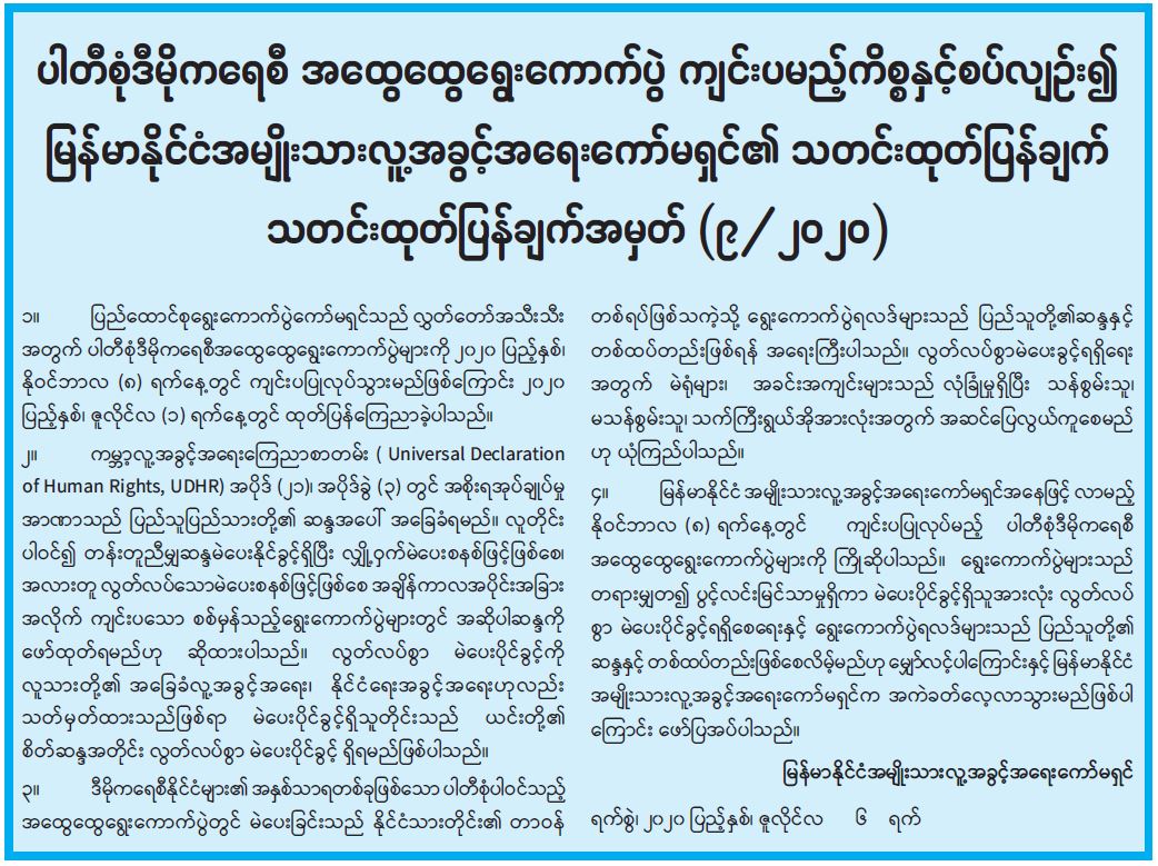 ပါတီစုံဒီမိုကရေစီ အထွေထွေရွေးကောက်ပွဲ ကျင်းပမည့်ကိစ္စနှင့်စပ်လျဉ်း၍ မြန်မာနိုင်ငံအမျိုးသား လူ့အခွင့်အရေးကော်မရှင်၏ သတင်းထုတ်ပြန်ချက်
