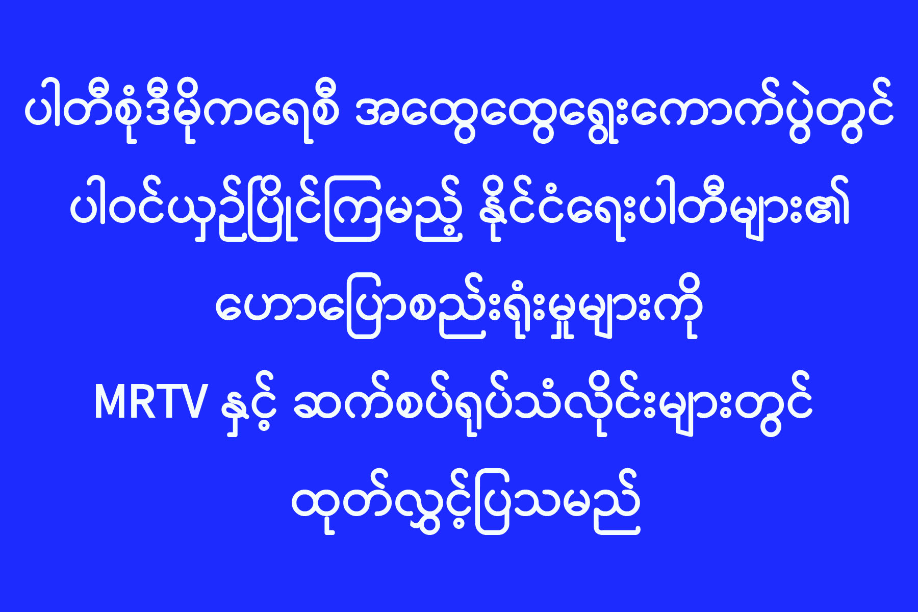 ၂၀၂၅ ခုနှစ် ဒီဇင်ဘာလ ၂၈ ရက်တွင် ကျင်းပမည့် ပါတီစုံဒီမိုကရေစီ အထွေထွေရွေးကောက်ပွဲ၌ ပါဝင်ယှဉ်ပြိုင်ကြမည့် နိုင်ငံရေးပါတီများ၏ ဟောပြောစည်းရုံးမှုများကို အောက်တိုဘာ ၂၈ ရက် ည ၇ နာရီမှစတင်၍ မြန်မာ့အသံနှင့် ရုပ်မြင်သံကြား၏ MRTV HD၊ MRTV Parliament နှင့် ဆက်စပ်ရုပ်သံလိုင်းများဖြစ်ကြသည့် MWD HD ၊ MWD Variety HD တို့မှလည်းကောင်း၊ မြန်မာ့ အသံရေဒီယို၊ သပြေရေဒီယို၊ သဇင် FM တို့နှင့် MRTV App: ၊ Radio App: အပါအဝင် MRTV Online Platform တို့မှလည်းကောင်း ထုတ်လွှင့်ပြသပေးမည်ဖြစ်သည်။