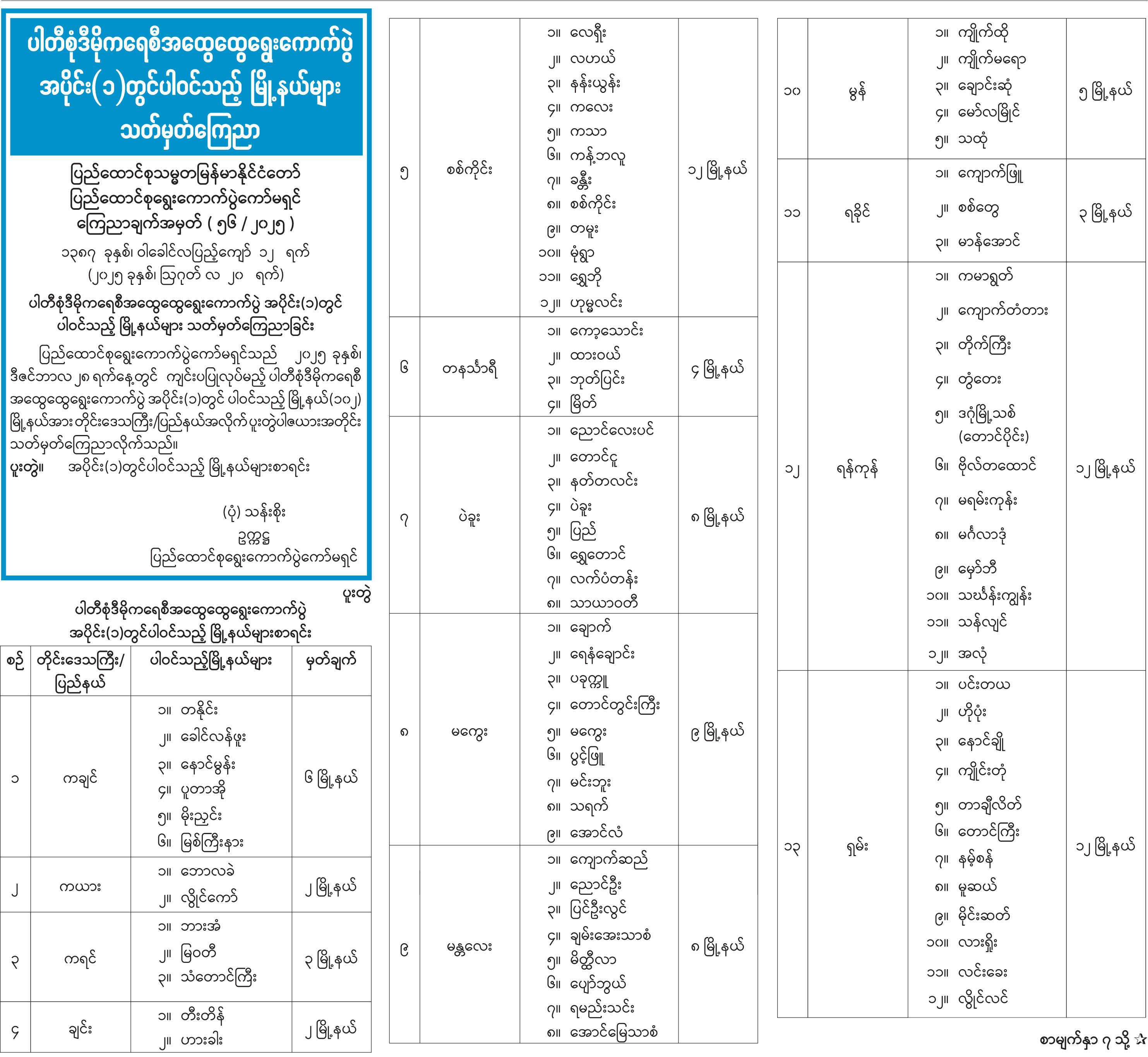 ပါတီစုံဒီမိုကရေစီအထွေထွေရွေးကောက်ပွဲ အပိုင်း(၁)တွင်ပါဝင်သည့် မြို့နယ်များ သတ်မှတ်ကြေညာ