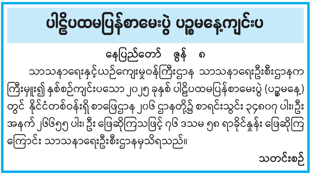 ပါဋ္ဌိပထမပြန်စာမေးပွဲ ပဉ္စမနေ့ကျင်းပ