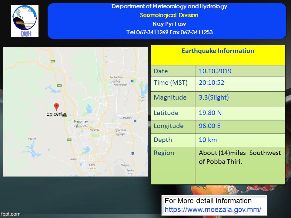 ၂၀၁၉ ခုနှစ်၊ အောက်တိုဘာလ (၁၀) ရက်နေ့၊ မြန်မာစံတော်ချိန် (၂၀)နာရီ၊ (၁၀)မိနစ်၊ (၅၂)စက္ကန့် အချိန်တွင် နေပြည်တော်မြေငလျင်စခန်းမှ အနောက်-အနောက်မြောက်ဘက် (၉)မိုင် ခန့်ကွာဝေးသော မြန်မာနိုင်ငံပြည်တွင်း (ပုဗ္ဗသီရိမြို့၏ အနောက်တောင်ဘက် (၁၄)မိုင် ခန့်အကွာ)၊ မြောက်လတ္တီတွဒ် (၁၉.၈၀)ဒီဂရီ၊ အရှေ့လောင်ဂျီတွဒ် (၉၆.ဝဝ)ဒီဂရီ၊ အနက် (၁၀) ကီလိုမီတာကို ဗဟိုပြု၍ အင်အားရစ်(ခ်)တာစကေး (၃.၃) အဆင့်ရှိ အင်အားအနည်းငယ်ရှိသော မြေငလျင်တစ်ခု လှုပ်ရှားသွားကြောင်း မိုးဇလမှ ထုတ်ပြန်ထားသည်။