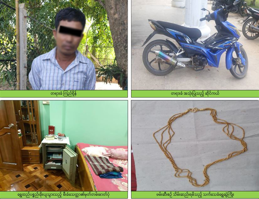 မြန်မာနိုင်ငံရဲတပ်ဖွဲ့၊ မှုခင်းရဲတပ်ဖွဲ့နှင့် နေပြည်တော်ရဲတပ်ဖွဲ့ဝင်များက တရားခံဖော်ထုတ်နိုင်ရေး စုံစမ်းထောက်လှမ်းနေချိန် အောက်တိုဘာ ၁၃ ရက်တွင် တရားခံဟုယူဆရသူသည် သပြေကုန်းဈေးအတွင်းရှိ ရွှေဆိုင်တစ်ဆိုင်သို့ ရွှေဆွဲကြိုးလာရောက်ပေါင်နှံရာ ရွှေဝယ်ဘောင်ချာ မပါရှိသဖြင့် ဆိုင်မှလက်မခံသောကြောင့် ဆိုင်ကယ်ဖြင့် ပြန်လည်ထွက်ခွာသွားကြောင်း သတင်းရရှိခဲ့ပြီး ရဲတပ်ဖွဲ့ဝင်များက CCTV မှတ်တမ်းများအရ စီးနင်းလာသည့် ဆိုင်ကယ်နံပါတ်နှင့် လူပုံသဏ္ဌာန်အား စိစစ်ရရှိခဲ့ကြောင်း၊ ယနေ့တွင် ယင်းနံပါတ်ပါ ဆိုင်ကယ်၏ သွားလာလှုပ်ရှားမှုကို စောင့်ကြည့်နေစဉ် အဆိုပါ မသင်္ကာတရားခံသည် မြို့မဈေးရှိ ရွှေဆိုင်တစ်ဆိုင်သို့ ရွှေဆွဲကြိုးတစ်ကုံးအား ထပ်မံလာရောက် ရောင်းချသည်ကိုတွေ့ရှိရ၍ ဥပဒေနှင့်အညီ ဖမ်းဆီးစစ်ဆေးခဲ့ရာ ၎င်းမှာ ဒက္ခိဏသီရိမြို့နယ်၊ ထန်းတပင်ကျေးရွာနေ ကြည်ရှိန်(၄၆)နှစ်ဖြစ်ပြီး ၎င်းရောင်းချသည့် ရွှေဆွဲကြိုးမှာ ပုဗ္ဗသီရီမြို့နယ်၊ သပြေလမ်းနေ ဒေါ်မော်မော်လွင်စိုးအား သတ်၍ နေအိမ်မှခိုးယူသွားသည့် ရွှေထည်ပစ္စည်းဖြစ်သည်ကို စစ်ဆေးပေါ်ပေါက်ခဲ့ကြောင်း။