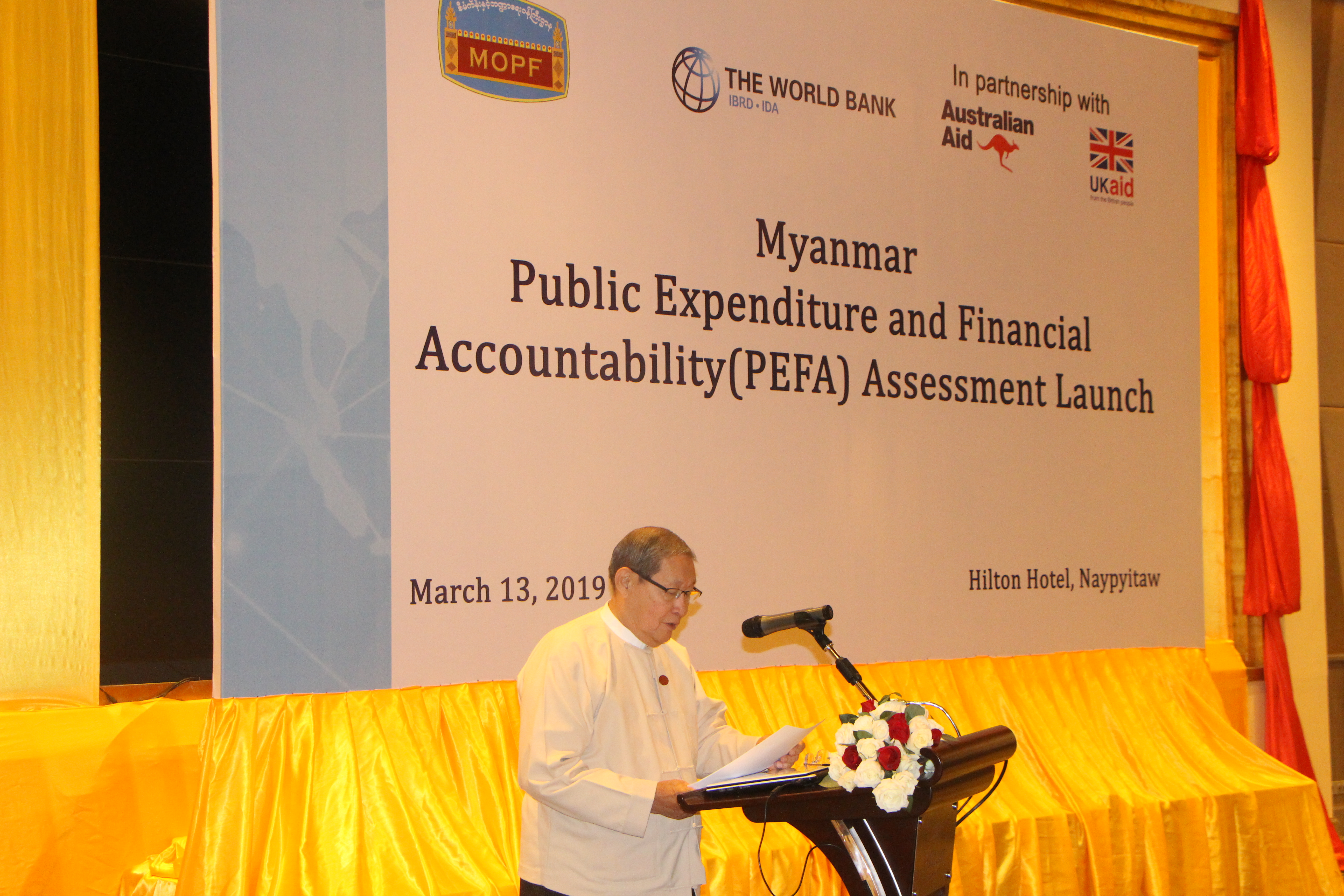 အခမ်းအနားတွင် ပြည်ထောင်စုဝန်ကြီး ဦးစိုးဝင်းက ကမ္ဘာ့ဘဏ်နှင့် ပူးပေါင်း၍ အစိုးရအသုံးစရိတ်နှင့် ဘဏ္ဍာရေးတာဝန်ယူမှုဆိုင်ရာ အကောင်အထည်ဖော်ဆောင်ရွက်မှု အကဲဖြတ်သုံးသပ်ခြင်းကို ၂၀၁၂ ခုနှစ်တွင် ပထမအကြိမ်အဖြစ် ဆောင်ရွက်ခဲ့ပြီး ၂၀၁၃ ခုနှစ် မေလတွင် Public Financial Management Performance Report ကို ထုတ်ဝေနိုင်ခဲ့ကြောင်း၊ အဆိုပါ PEFA Assessment သည် နိုင်ငံတော်၏ ပြည်သူ့ဘဏ္ဍာ ရေးစီမံခန့်ခွဲမှု ပြုပြင်ပြောင်းလဲရေးဆောင်ရွက်ရာတွင် အထောက်အကူပြုနိုင်ခဲ့ကြောင်း၊ ယခုကမ္ဘာ့ဘဏ်၏ PEFA မစ်ရှင်အဖွဲ့မှ ကျွမ်းကျင်ပညာရှင်များနှင့် ပူးပေါင်း၍ ဒုတိယ အကြိမ် အစိုးရ အသုံးစရိတ်နှင့် ဘဏ္ဍာရေးတာဝန်ယူမှုဆိုင်ရာ အကဲဖြတ်သုံးသပ်မှုကို အကောင်အထည်ဖော် ဆောင်ရွက်နိုင်ရန်အတွက် ယနေ့အခမ်းအနားကို ကျင်းပခြင်းဖြစ် ကြောင်း ပြောကြားသည်။