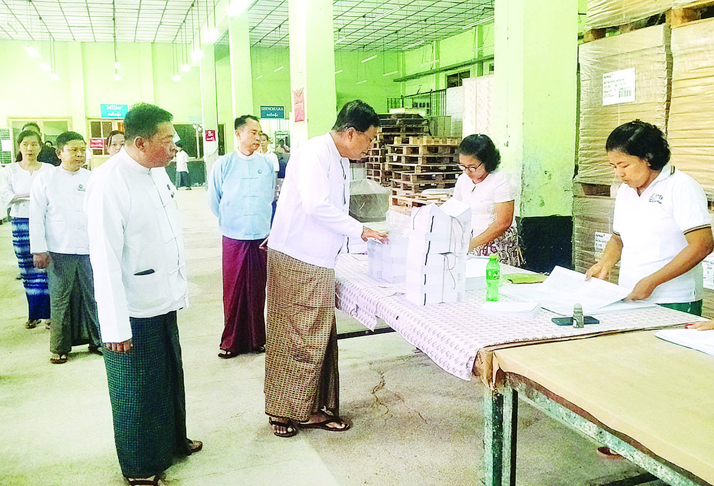 ထို့နောက် အင်းစိန်မြို့နယ်ရှိ ဂျီတီစီပုံနှိပ်စက်ရုံ၊ စာပေပုံနှိပ်စက်ရုံနှင့် အောင်ဆန်းပုံနှိပ်စက်ရုံတို့မှ စက်ရုံမှူးများနှင့် အရာထမ်းများအားတွေ့ဆုံ၍ ကုန်ကြမ်းပစ္စည်းများ စနစ်တကျထားသို၊ ထုတ်ယူအသုံးပြုရေး၊ ပုံနှိပ်ထုတ်လုပ်မှုလုပ်ငန်းများ အရည်အသွေးကောင်းမွန်ရေးနှင့် အချိန်မီပြီးစီးရေး၊ စက်ပစ္စည်းများပျက်စီးမှုမရှိအောင် ထိန်းသိမ်းကိုင်တွယ်ဆောင်ရွက်ရေး၊ ရွေးကောက်ပွဲအောင်မြင်စွာကျင်းပနိုင်ရေးအတွက် ဝိုင်းဝန်းကြိုးပမ်းဆောင်ရွက်ရေးနှင့် မဲပေးခွင့်ရှိသူ ဝန်ထမ်းနှင့်မိသားစုများ မဲပေးနိုင်ရေး၊ လုံခြုံရေးအလေးထားဆောင်ရွက်ရေးနှင့် ဝန်ထမ်းများအား နိုင်ငံ့ဝန်ထမ်းပီသစွာ ဝန်ထမ်းသစ္စာအဓိဋ္ဌာန် ၆ ချက်နှင့်အညီ ကြိုးစားနေထိုင်ပြီး ဝန်ထမ်းကောင်းများဖြစ်အောင် အသိပညာပေး လေ့ကျင့်ပေးကြရန်မှာကြားခဲ့သည်။