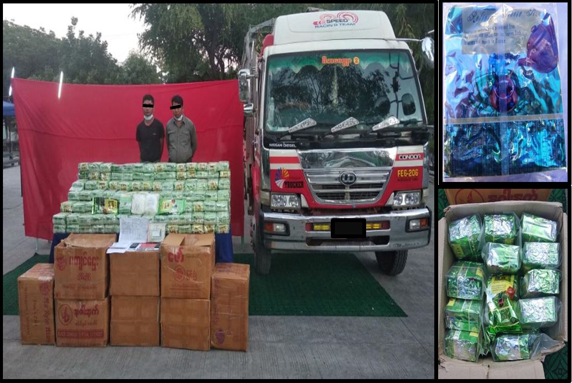 အကောက်ခွန်ဦးစီးဌာနမှ ဝန်ထမ်းများပါဝင်သော ပူးပေါင်းအဖွဲ့သည် ဒီဇင်ဘာ ၂၅ ရက် နံနက် ၁၀ နာရီခွဲက ပုသိမ်ကြီးမြို့နယ် အုန်းချောကျေးရွာ (၁၆)မိုင်ပူးပေါင်း စစ်ဆေးရေးစခန်းတွင် မူဆယ်မှ မန္တလေးသို့ မောင်းနှင်လာသည့် ၆ ဘီး မော်တော်ယာဉ်ကို ရပ်တန့်စစ်ဆေးစဉ် ယာဉ်မောင်းမှာ ထွက်ပြေးတိမ်းရှောင် သွားပြီး ယာဉ်ပေါ်၌ တားမြစ်ကန့်သတ်ကုန်ပစ္စည်းများ ပါရှိသဖြင့် အဆိုပါယာဉ်အား ပြည်ကြီးတံခွန်မြို့နယ်၊ အကောက်ခွန်ဦးစီးဌာနမှူးရုံးသို့ မောင်းနှင်ပြီး မူးယစ်ဆေးဝါး တားဆီးနှိမ်နင်းရေးရဲတပ်ဖွဲ့နှင့် ပူးပေါင်း၍ အသေးစိတ်ရှာဖွေခဲ့ရာ အိုက်စ် ၃၄၃ ကီလို သိမ်းဆည်းရမိသည်။