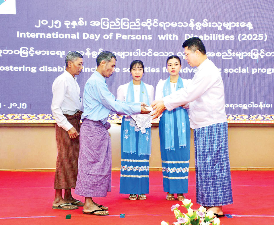 ဆက်လက်၍ တိုင်းဒေသကြီးဝန်ကြီးချုပ်နှင့် ဧည့်သည်တော်များသည် ကုလသမဂ္ဂ အထွေထွေ အတွင်းရေးမှူးချုပ်က ပေးပို့သည့် အပြည်ပြည်ဆိုင်ရာ မသန်စွမ်းသူများနေ့ သဝဏ်လွှာ Video Clip ပြသမှုနှင့် မြန်မာနိုင်ငံတွင် ဆောင်ရွက်လျက်ရှိသည့် မသန်စွမ်းသူများအရေးနှင့် ပတ်သက်သည့် Video Clip ပြသမှုများကိုကြည့်ရှုအားပေးပြီး တိုင်းဒေသကြီးဝန်ကြီးချုပ်က မသန်စွမ်းသူများအား နိုင်ငံသားစိစစ်ရေးကတ်များနှင့် ထိုင်းနိုင်ငံတွင် ကျင်းပမည့် အရှေ့တောင်အာရှ အားကစားပြိုင်ပွဲသို့ ဝင်ရောက်ယှဉ်ပြိုင်မည့် ဧရာဝတီတိုင်းဒေသကြီးမှ မသန်စွမ်းအားကစားသမားများအား ဂုဏ်ပြုငွေများကိုလည်းကောင်း၊ အပြည်ပြည်ဆိုင်ရာ မသန်စွမ်းသူများနေ့ အထိမ်းအမှတ်အကြို အခြေခံ ပညာအထက်တန်းအဆင့် စာစီစာကုံးပြိုင်ပွဲတွင် ပထမ၊ ဒုတိယနှင့် တတိယဆုရရှိသူများအား တိုင်းဒေသကြီး အမျိုးသမီးရေးရာအဖွဲ့နာယက တိုင်းဒေသကြီး ဝန်ကြီးချုပ်၏ ဇနီးကလည်းကောင်း၊ အခြေခံပညာအလယ်တန်းအဆင့် စာစီစာကုံးပြိုင်ပွဲတွင် ပထမ၊ ဒုတိယနှင့် တတိယဆု ရရှိသူများအား တိုင်းဒေသကြီး မသန်စွမ်းသူများ၏ အခွင့်အရေးများဆိုင်ရာ ကော်မတီဒုတိယ ဥက္ကဋ္ဌ လူမှုရေးရာဝန်ကြီးက လည်းကောင်း ဆုများချီးမြှင့် ပေးအပ်ကြပြီး စုပေါင်းမှတ်တမ်းတင်ဓာတ်ပုံ ရိုက်ခဲ့ကြကြောင်း သိရသည်။
