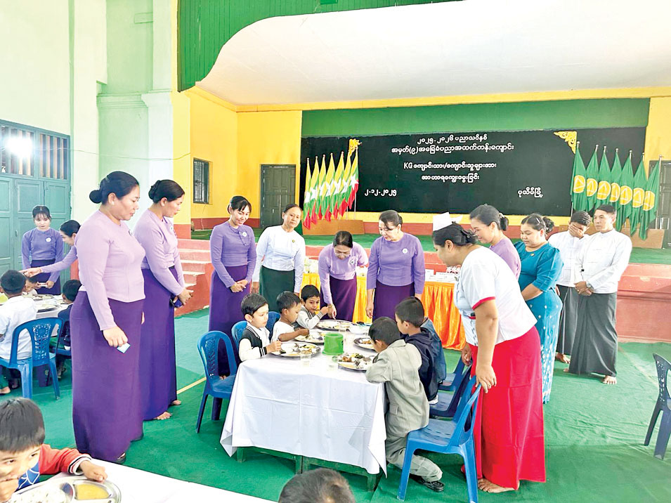 ကျန်းမာရေးဝန်ကြီးဌာနနှင့် ပညာရေးဝန်ကြီးဌာနတို့ ပူးပေါင်းဆောင်ရွက်သော KG ကျောင်းသား ကျောင်းသူများအား အာဟာရကျွေးမွေးခြင်းကို ယမန်နေ့နံနက်ပိုင်းက ပုသိမ်မြို့ အမှတ်(၉) အခြေခံပညာအထက်တန်းကျောင်း၌ ကျင်းပသည်။