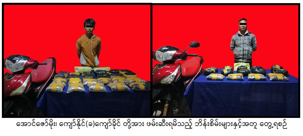 မူးယစ်‌ဆေးဝါး တားဆီးနှိမ်နင်းရေးရဲတပ်ဖွဲ့မှ တပ်ဖွဲ့ဝင်များ ပါဝင်သော ပူးပေါင်းအဖွဲ့သည် မေ ၂၈ ရက် ည ၁ဝ နာရီက ရွာငံမြို့နယ်၊ တပ်ကုန်းကျေးရွာအနီး၊ အောင်ပန်း-ရွာငံသွား ကားလမ်းတွင် အောင်ဇော်မိုး မောင်းနှင်လာသော မော်တော်ဆိုင်ကယ်ကို ရပ်တန့်ရှာဖွေရာ ဘိန်းစိမ်း ၃၄ ဒသမ ၅ ကီလိုကို လည်းကောင်း၊ ဆက်လက်၍ အဆိုပါနေရာ၌ ကျော်နိုင် (ခ) ကျော်ခိုင် မောင်းနှင်လာသည့် မော်တော် ဆိုင်ကယ်ကို ရပ်တန့်ရှာဖွေရာ ဘိန်းစိမ်း ၂၁ ကီလိုကိုလည်းကောင်း ထပ်မံသိမ်းဆည်းရမိခဲ့သဖြင့် အောင်ဇော်မိုး (၂၆) နှစ်၊ ကျော်နိုင် (ခ) ကျော်ခိုင် (၄၅) နှစ်တို့အား မူးယစ်ဆေးဝါးနှင့် စိတ်ကို ပြောင်းလဲစေသော ဆေးဝါးများဆိုင်ရာ ဥပဒေအရ အရေးယူထားကြောင်း  သိရသည်။