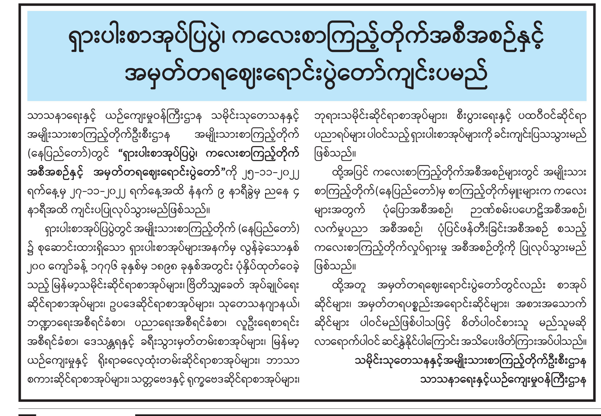 ရှားပါးစာအုပ်ပြပွဲ၊ ကလေးစာကြည့်တိုက်အစီအစဉ်နှင့် အမှတ်တရဈေးရောင်းပွဲတော်ကျင်းပမည်