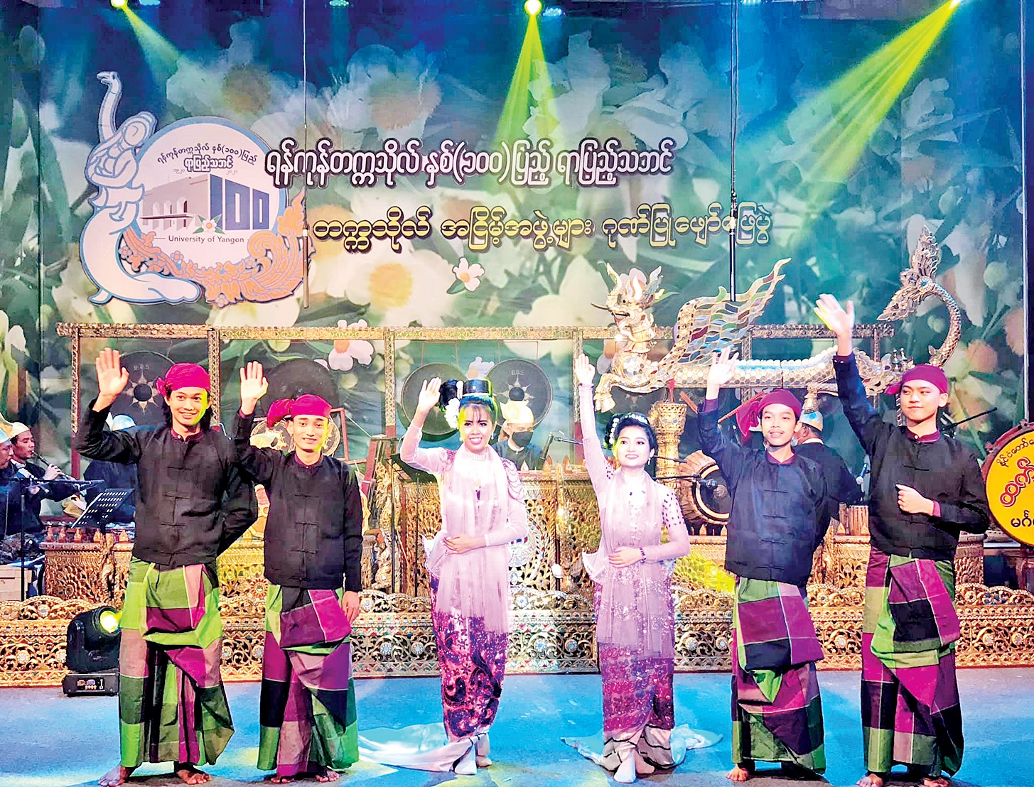 “နှစ်ထောင့်နှစ်ဆယ်မှာ      နှစ်တစ်ရာပြည့်ခဲ့ပြီ ရန်ကုန်တက္ကသိုလ်သည်… အဓိပတိလမ်းနဲ့  အင်းလျား ကန်ကြီးသည်  သစ်ပုပ်ပင်နဲ့   ပဏာတင့်လေသည်… နှစ်ထောင့်နှစ်ဆယ် နှစ်ပေါင်း (၁၀၀) ပြည့်ခဲ့လေပြီ… မြန်မာတစ်နိုင်ငံလုံး   အကြီးဆုံးတက္ကသိုလ်ကြီး   လှပ ခံ့ညား ဝင့်ကြွားခဲ့လေပြီ x x x”