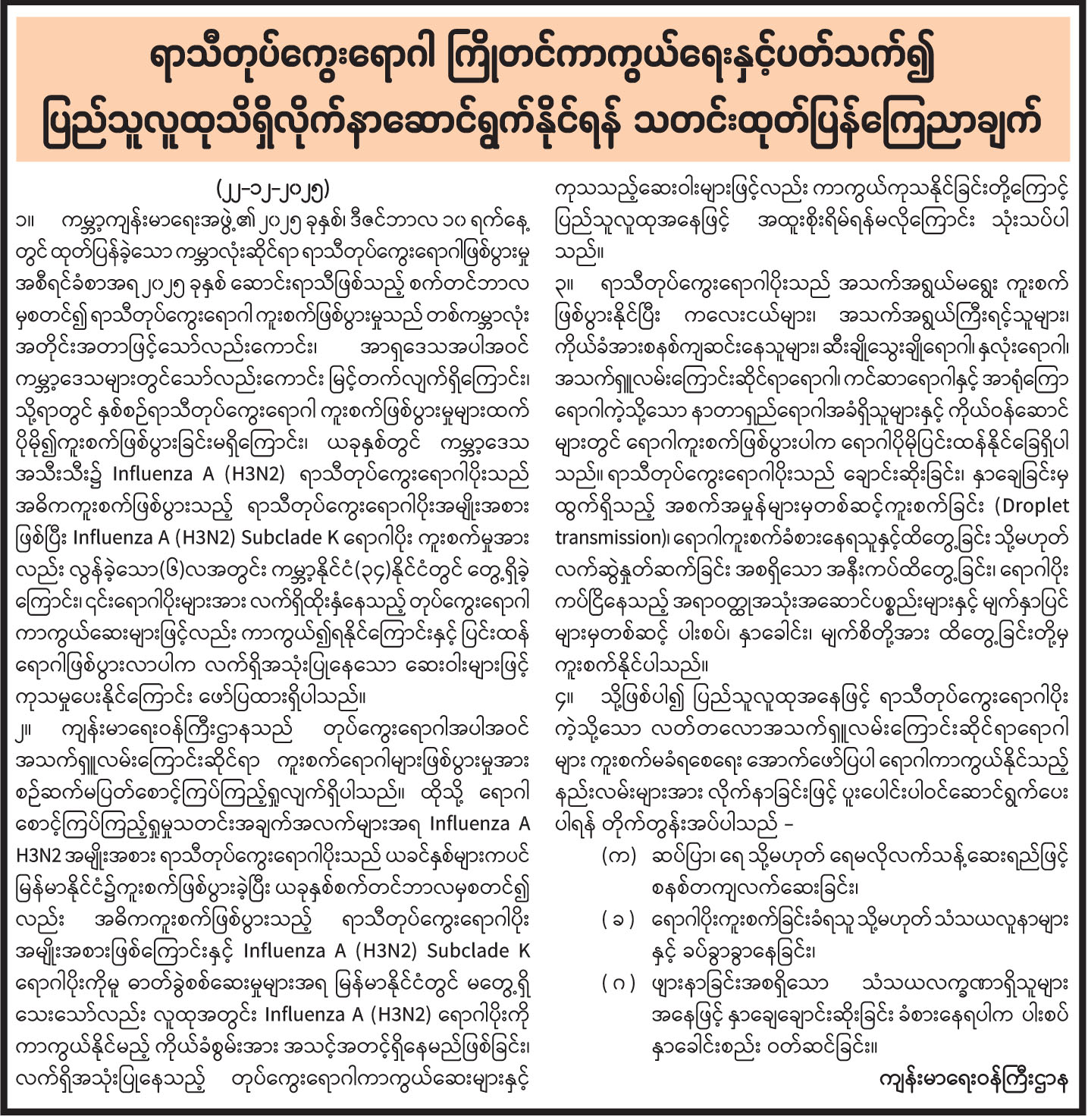 ရာသီတုပ်ကွေးရောဂါ ကြိုတင်ကာကွယ်ရေးနှင့်ပတ်သက်၍ ပြည်သူလူထုသိရှိလိုက်နာဆောင်ရွက်နိုင်ရန် သတင်းထုတ်ပြန်ကြေညာချက်