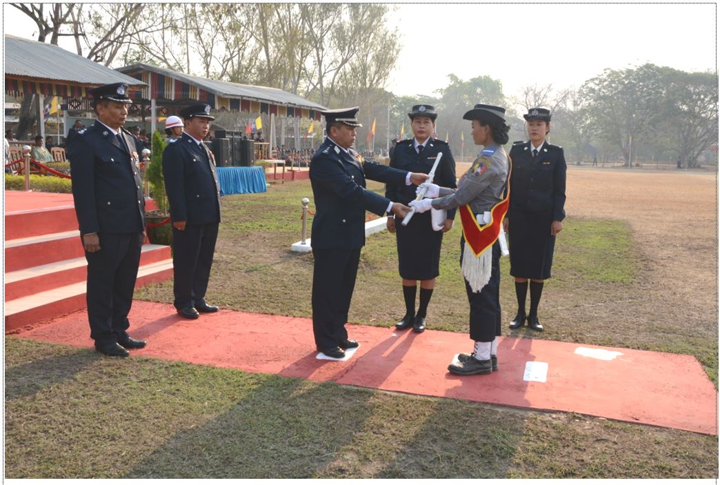 ထို့နောက် ကျောင်းအုပ်ကြီးမှ သင်တန်းဆင်း အမှာစကားပြောကြားပြီး ကျောင်းဆင်းသင်တန်းသူများမှ တန်းစိတ်ပုံ၊ စစ်ကြောင်းပုံဖြင့် ချီတက်အလေးပြု ခြင်းကို ခံယူသည်။ကျောင်းဆင်းသင်တန်းသူ(၉၈)ဦးရှိပြီး သင်တန်းဆင်းပွဲသို့ အရာရှိ/အခြားအဆင့် တပ်ဖွဲ့ဝင်(၁၃၀)ဦး ၎င်းတို့၏မိဘဆွေမျိုးများ၊ ဖိတ်ကြားထား သည့် ဧည့်သည်တော်များ တက်ရောက်ခဲ့ကြကြောင်း ရဲပြန်ကြားမှ သိရသည်။