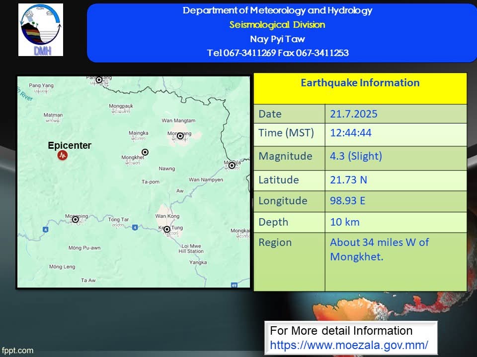 ၂၀၂၅ ခုနှစ်၊ ဇူလိုင်လ ၂၁ ရက်နေ့၊ မြန်မာစံတော်ချိန် (၁၂) နာရီ၊ (၄၄) မိနစ်၊ (၄၄) စက္ကန့် အချိန်တွင် ကျိုင်းတုံမြေငလျင်စခန်းမှ အနောက်မြောက်ဘက် (၅၂) မိုင်ခန့်အကွာ၊ မြန်မာနိုင်ငံ ပြည်တွင်း (မိုင်းခတ်မြို့၏ အနောက်ဘက် (၃၄) မိုင်ခန့်အကွာ)၊ မြောက်လတ္တီတွဒ် (၂၁.၇၃) ဒီဂရီ၊ အရှေ့လောင်ဂျီတွဒ် (၉၈.၉၃) ဒီဂရီ၊ အနက် (၁၀) ကီလိုမီတာကို ဗဟိုပြု၍ အင်အား ရစ်(ခ်)တာ စကေး (၄.၃) အဆင့်ရှိ အင်အား အနည်းငယ်ရှိသော မြေငလျင်တစ်ခု လှုပ်ရှားသွားကြောင်း တိုင်းထွာရရှိပါသည်။