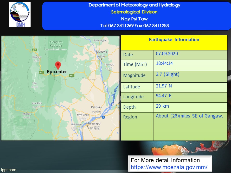 ၂၀၂၀ ပြည့်နှစ်၊ စက်တင်ဘာ ၇ ရက်၊ မြန်မာစံတော်ချိန် (၁၈) နာရီ၊ (၄၄) မိနစ်တွင် ညောင်ဦးမြေငလျင်စခန်းမှ အနောက်မြောက်ဘက် မိုင်(၆၀) ခန့်ကွာဝေးသော ဂန့်ဂေါမြို့၏ အ‌ရှေ့တောင်ဘက် (၂၆) မိုင် ခန့်အကွာ၊ မြောက်လတ္တီတွဒ် (၂၁ ဒသမ ၉၇) ဒီဂရီ၊ အရှေ့လောင်ဂျီတွဒ် (၉၄ ဒသမ ၄၇)ဒီဂရီ၊ အနက် (၂၉)ကီလိုမီတာ ကို ဗဟိုပြု၍ အင်အား ရစ်(ခ်)တာစကေး (၃ ဒသမ ၇)အဆင့်ရှိ အင်အားအနည်းငယ်ရှိသော မြေငလျင်တစ်ခု လှုပ်ရှားသွားကြောင်း သိရသည်။