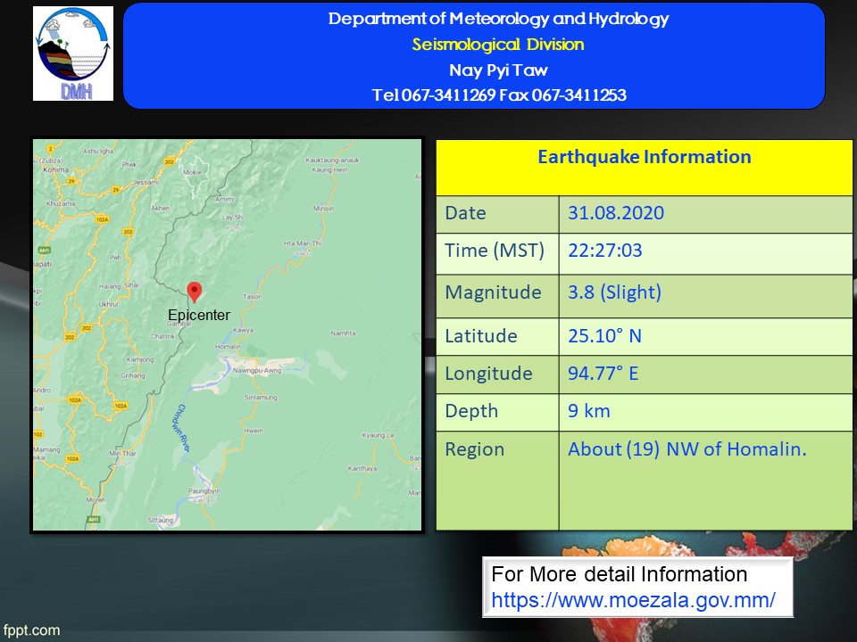မြန်မာစံတော်ချိန် (၂၂) နာရီ၊ (၂၇) မိနစ်တွင် တမူးမြေငလျင်စခန်းမှ မြောက်-အရှေ့မြောက်ဘက် (၆၇) မိုင်ခန့်အကွာ၊ ဟုမ္မလင်းမြို့၏ အနောက်မြောက်ဘက် (၁၉) မိုင်ခန့်အကွာ မြောက်လတ္တီတွဒ် (၂၅ ဒသမ ၁၀) ဒီဂရီ၊ အရှေ့လောင်ဂျီတွဒ် (၉၄ ဒသမ ၇၇) ဒီဂရီ၊ အနက် (၉) ကီလိုမီတာကို ဗဟိုပြု၍ အင်အား ရစ်(ခ်)တာစကေး (၃ ဒသမ ၈) အဆင့်ရှိ အင်အားအနည်းငယ်ရှိသော မြေငလျင်တစ်ခု လှုပ်ရှားသွားကြောင်း တိုင်းထွာရရှိပါသည်။