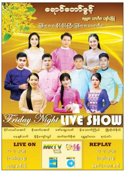 မြန်မာ့အသံနှင့်ရုပ်မြင်သံကြားအနေဖြင့် ပြည်သူများ အပန်းပြေစေရန်နှင့် စိတ်ခွန်အားသစ်များ ရရှိနိုင်ရန် ရည်ရွယ်ပြီး Friday Night Live Show တေးဂီတဖျော်ဖြေပွဲများကို ဆန်းသစ်တင်ဆက် လျက်ရှိရာ “ရောင်တော်ဖွင့်” ဓမ္မပူဇာတေးဂီတ ဖျော်ဖြေပွဲကို ဇူလိုင် ၁၁ ရက်(သောကြာနေ့) ည ၉ နာရီခန့်၌ မြန်မာ့အသံနှင့် ရုပ်မြင်သံကြား၏ MRTV-HD Channel နှင့် MRTV Entertainment Channel တို့မှ တိုက်ရိုက်(Live)ထုတ်လွှင့် ပြသမည်ဖြစ်သည်။
