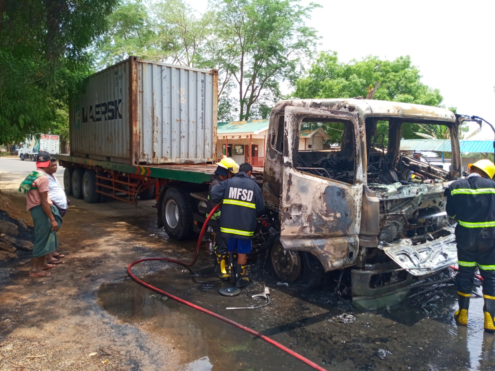 ယနေ့ နံနက် ၁၁ နာရီ မိနစ် ၅၀ ခန့်က မကွေး-တောင်တွင်းကြီး ကားလမ်းရှိ မကွေးတိုးဂိတ်အနီး မိုင်တိုင်အမှတ် (၃၂၄/၅) တွင် ရန်ကုန်မှ မင်းဘူးသို့ ယာဉ်မောင်း ဦးစောဇင်ကို (ဘ) ဦးဝင်းမြင့်၊ (၂၅) နှစ် မောင်းနှင်၍ ယာဉ်နောက်လိုက် ကိုထွန်းလင်းပိုင် (ဘ) ဦးသက်ပိုင်၊ (၁၈) နှစ် လိုက်ပါသော 9/ ------(၁၈)ဘီး ကွန်တိန်နာတင် တွဲယာဉ်သည် အချိန်ကြာမြင့်စွာ မောင်းနှင်လာပြီး ရှေ့ဘီးဘရိတ်ရှူး ငြိရာမှ အပူလွန်ကဲ၍ မီးလောင်မှုဖြစ်ပွားခဲ့ကြောင်း သိရသည်။