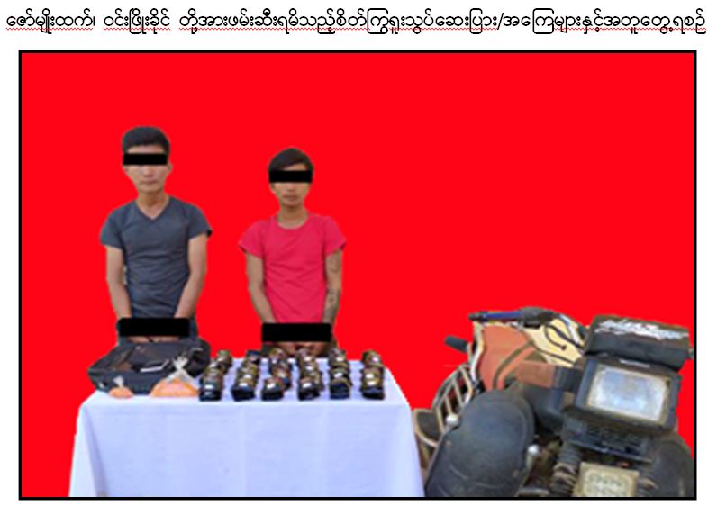 ရွှေဘိုခရိုင်ရဲတပ်ဖွဲ့မှ တပ်ဖွဲ့ဝင်များသည် ဇူလိုင် ၂၄ ရက် မွန်းလွဲပိုင်းတွင် သတင်းအရ ရွှေဘိုမြို့ အမှတ်(၅)ရပ်ကွက်ရှိ စားသောက်ဆိုင်အတွင်း ဝင်ရောက်ရှာဖွေရာ ကျော်ကျော်ထွန်း နှင့် နေမင်းဦး တို့အားတွေ့ရှိရပြီး ၎င်းတို့နှစ်ဦးထံမှ စိတ်ကြွရူးသွပ် ဆေးပြား ၁၈,၁၇၄ ပြား၊ စိတ်ကြွရူးသွပ်ဆေးပြားအကြေ သုည ဒသမ ၀၅ ကီလို၊ မြန်မာငွေကျပ် ၁၁,၅၀၀ နှင့် မော်တော်ဆိုင်ကယ်တစ်စီးတို့ကို လည်းကောင်း၊
