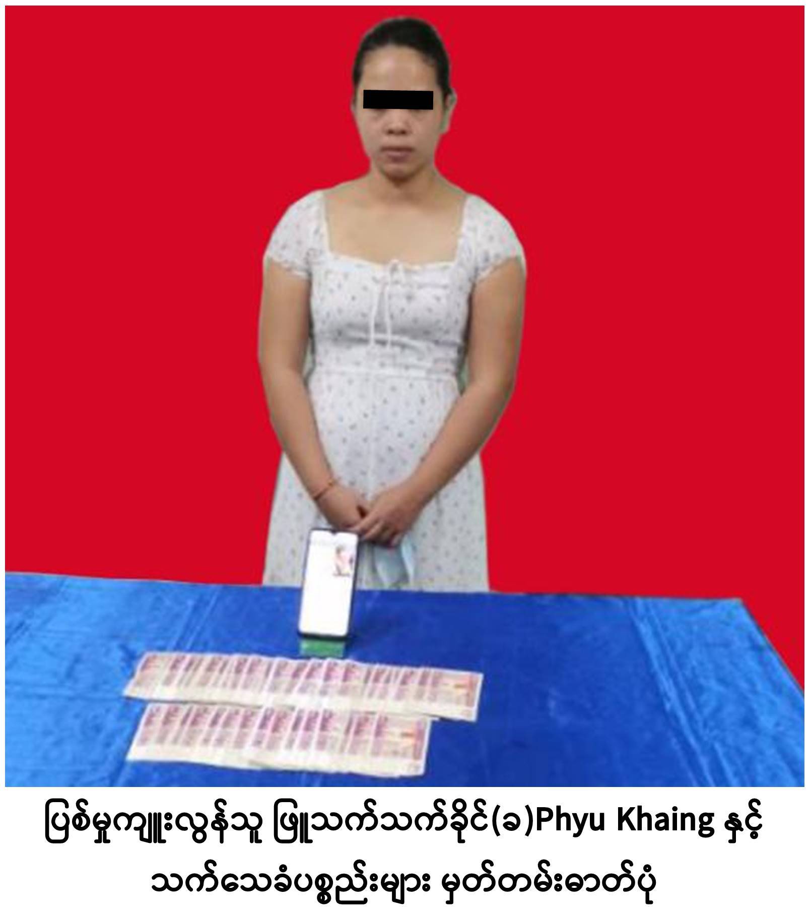 ရန်ကုန်တိုင်းဒေသကြီးရဲတပ်ဖွဲ့မှူးရုံး၊ မှုခင်းအကူဌာနစုမှတပ်ဖွဲ့ဝင်များ၊ အနောက်ပိုင်းခရိုင် မှုခင်းနှိမ်နင်းရေးဌာနစုမှ တပ်ဖွဲ့ဝင်များ၊ ကမာရွတ်မြို့နယ်ရဲတပ်ဖွဲ့မှ တပ်ဖွဲ့ဝင်များသည် ပြစ်မှုကျူးလွန်သူအား ဖော်ထုတ်ဖမ်းဆီးရမိရေး ဆောင်ရွက်ခဲ့ရာ ဖုန်းနံပါတ် ၀၉-၉၆၀၉၄၁၈၃၇ ကိုင်ဆောင်သူမှာ ဒဂုံမြို့သစ်(အရှေ့ပိုင်း)မြို့နယ်၊ (၆)ရပ်ကွက်၊ ကြိုးကြာ(၂)လမ်း၊ အမှတ် (၁၂၆၁)နေ ဖြူသက်သက်ခိုင်(ခ)Phyu Khaing ဖြစ်ကြောင်း သိရှိရ၍ ၎င်းအား ဒီဇင်ဘာ ၃၀  ရက်နေ့တွင် အမှုဖြင့်ဖမ်းဆီးစစ်ဆေးရာ အဆိုပါအမှုအား ကျူးလွန်ခဲ့ကြောင်းနှင့် သက်သေခံပစ္စည်း ငွေ(၃,၀၇၀,၀၀၀)ကျပ်အား ပြန်လည် သိမ်းဆည်းရရှိပြီးဖြစ်၍ ဥပဒေနှင့်အညီ အမြန်တရားစွဲတင်ပို့ နိုင်ရေး ဆောင်ရွက်လျက်ရှိကြောင်း သတင်းရရှိသည်။