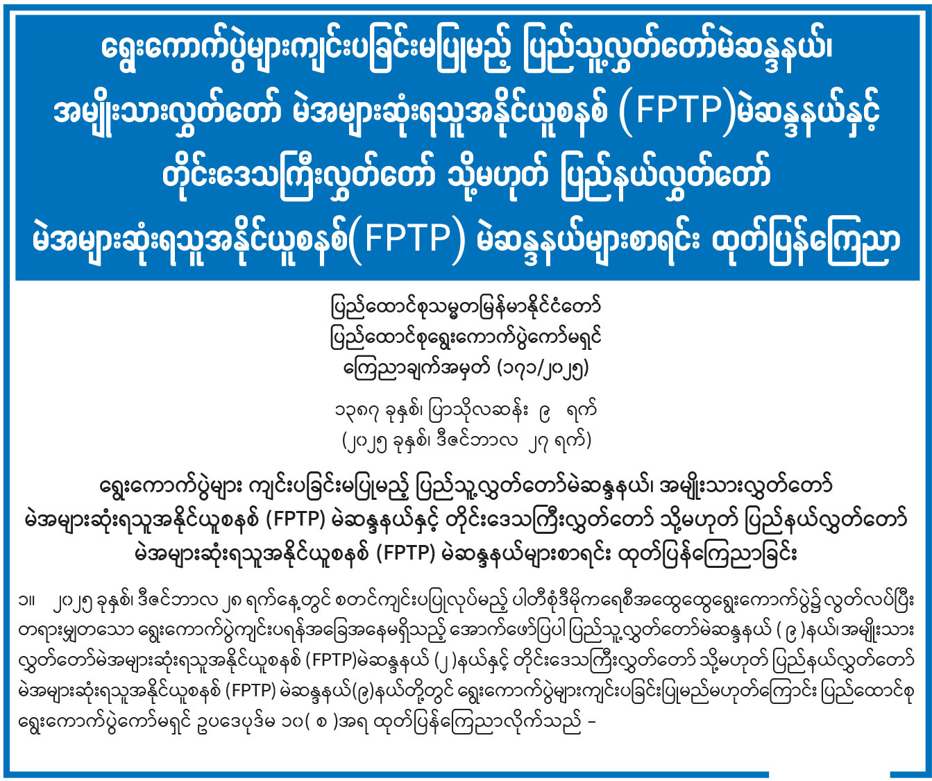 ရွေးကောက်ပွဲများ ကျင်းပခြင်းမပြုမည့် ပြည်သူ့လွှတ်တော်မဲဆန္ဒနယ်၊ အမျိုးသားလွှတ်တော် မဲအများဆုံး ရသူအနိုင်ယူစနစ် (FPTP) မဲဆန္ဒနယ်နှင့် တိုင်းဒေသကြီးလွှတ်တော် သို့မဟုတ် ပြည်နယ်လွှတ်တော် မဲအများဆုံးရသူအနိုင်ယူစနစ် (FPTP) မဲဆန္ဒနယ်များစာရင်း ထုတ်ပြန်ကြေညာ