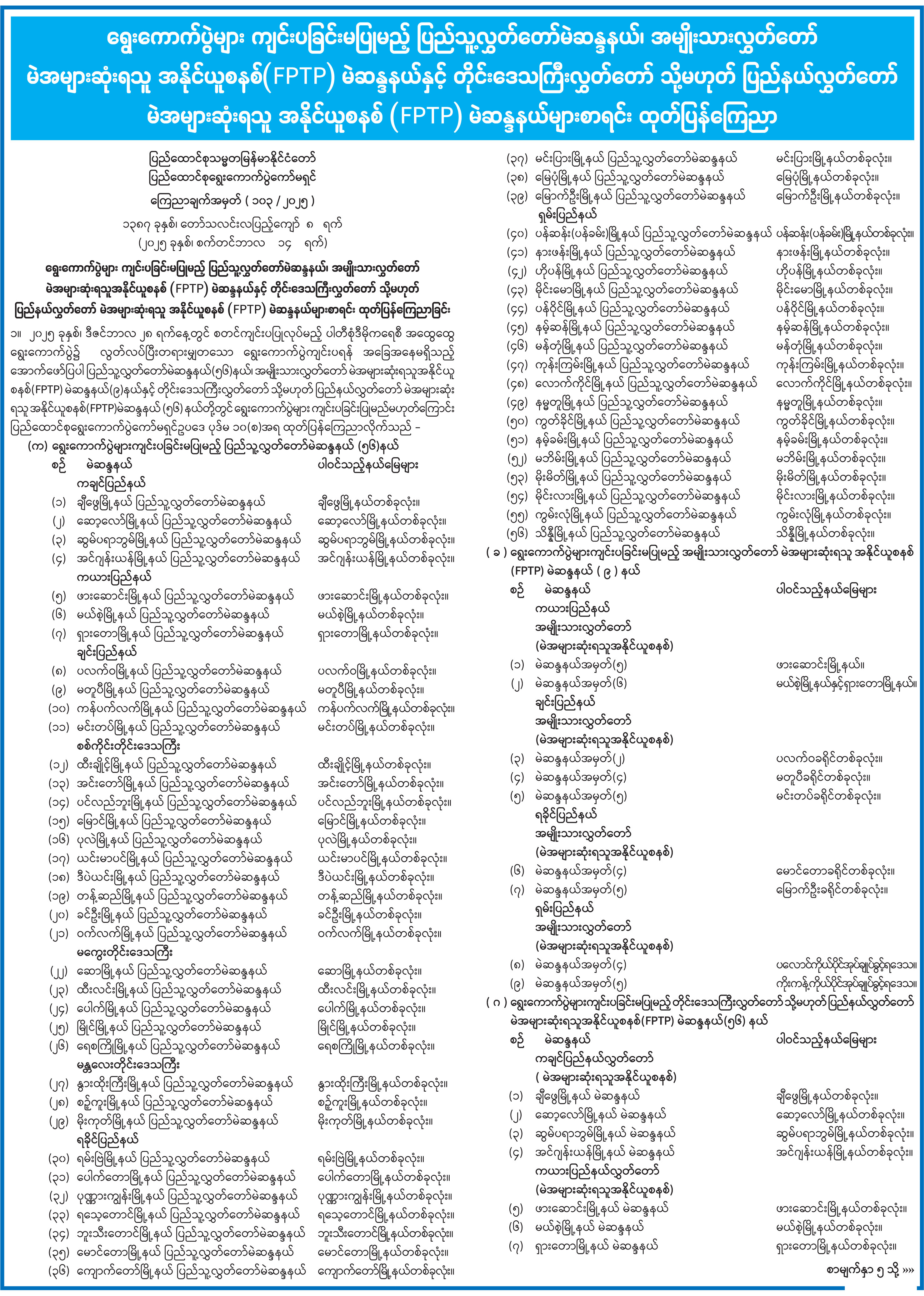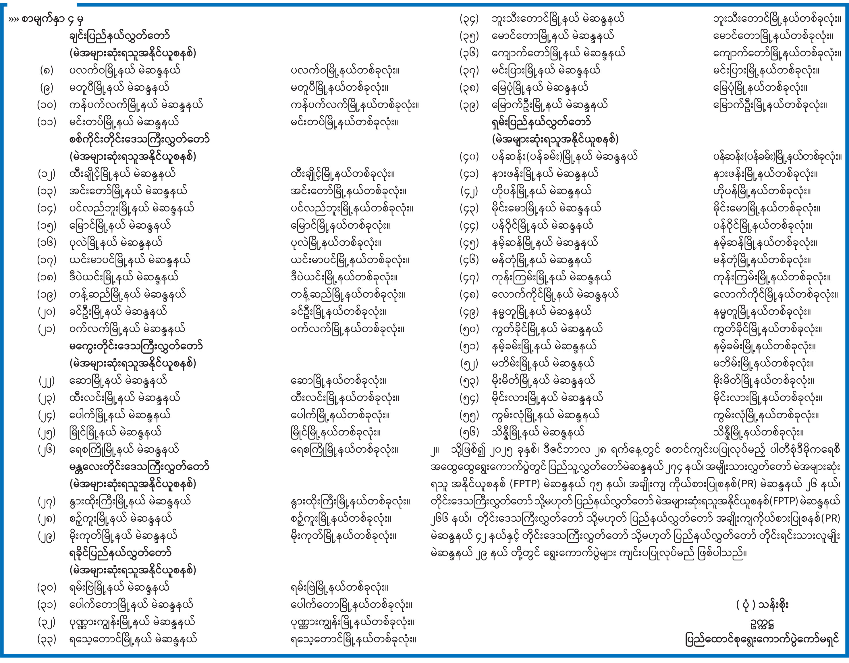 ရွေးကောက်ပွဲများကျင်းပခြင်းမပြုမည့် ပြည်သူ့လွှတ်တော်မဲဆန္ဒနယ်၊ အမျိုးသားလွှတ်တော် မဲအများဆုံးရသူအနိုင်ယူစနစ် (FPTP) မဲဆန္ဒနယ်နှင့် တိုင်းဒေသကြီးလွှတ်တော် သို့မဟုတ် ပြည်နယ်လွှတ်တော် မဲအများဆုံးရသူအနိုင်ယူစနစ် (FPTP) မဲဆန္ဒနယ်များစာရင်း ထုတ်ပြန်ကြေညာ