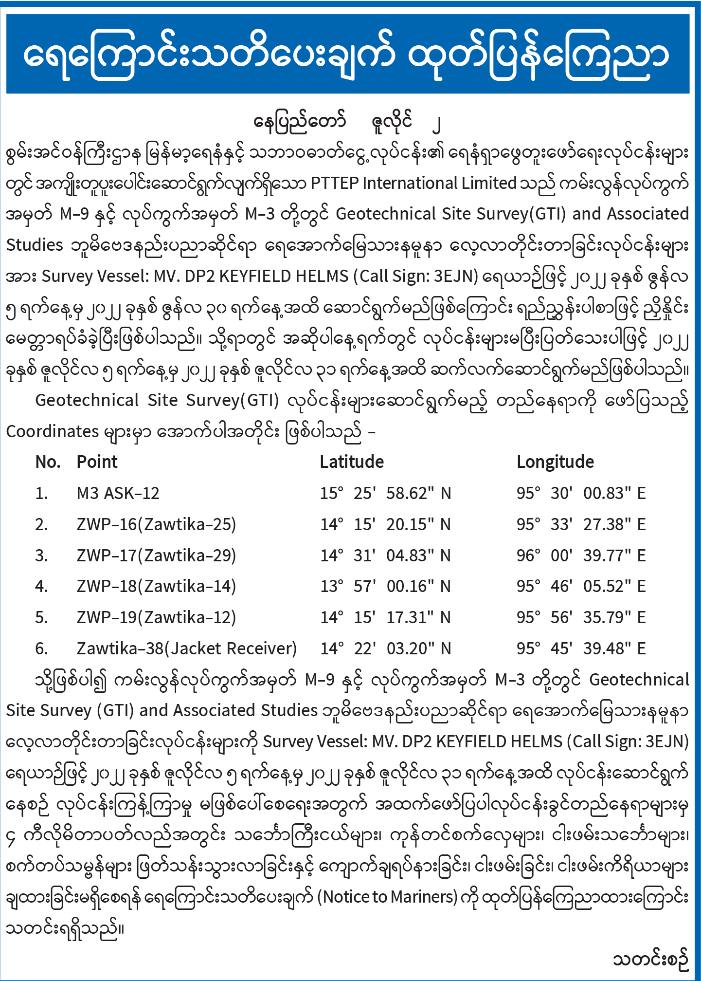 ရေကြောင်းသတိပေးချက် ထုတ်ပြန်ကြေညာ
