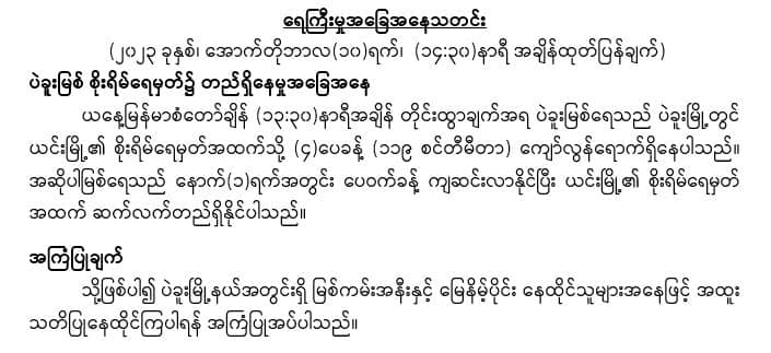 မိုးလေဝသနှင့်ဇလဗေဒညွှန်ကြားမှုဦးစီးဌာနမှ (၁၀.၁၀.၂၀၂၃) ရက်နေ့တွင် ရေကြီးမှုအခြေအနေသတင်းကို အောက်ပါအတိုင်း ထုတ်ပြန်ထားပါတယ်…