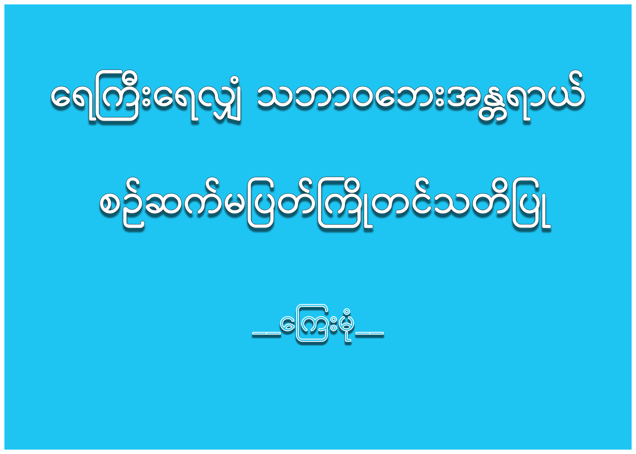 ယခုအခါ ရာသီဥတုဖောက်ပြန်ပြောင်းလဲမှုဖြစ်စဉ်ကြောင့် အချိန်အခါမဟုတ် မိုးသည်းထန်စွာရွာသွန်းခြင်းနှင့် လေပြင်းတိုက်ခတ်ခြင်းများ ဖြစ်ပေါ်လျက်ရှိရာ ဖြစ်ပေါ်နိုင်သည့်ဒေသများကို မိုးလေဝသနှင့် ဇလဗေဒ ညွှန်ကြားမှုဦးစီးဌာနက ကြိုတင်အသိပေးထုတ်ပြန်ထားသည်။ ထို့ကြောင့် ပြီးခဲ့သည့်သဘာဝဘေးအန္တရာယ် ဖြစ်စဉ်များကို သင်ခန်းစာယူပြီး သက်ဆိုင်ရာအဖွဲ့အစည်းများနှင့် သဘာဝဘေးကျရောက်နိုင်သည့်ဒေသများမှ ပြည်သူများက ဆောင်ရွက်ဖွယ်ရာများကို ကြိုတင်ပြင်ဆင် ဆောင်ရွက်ထားရမည်ဖြစ်သည်။