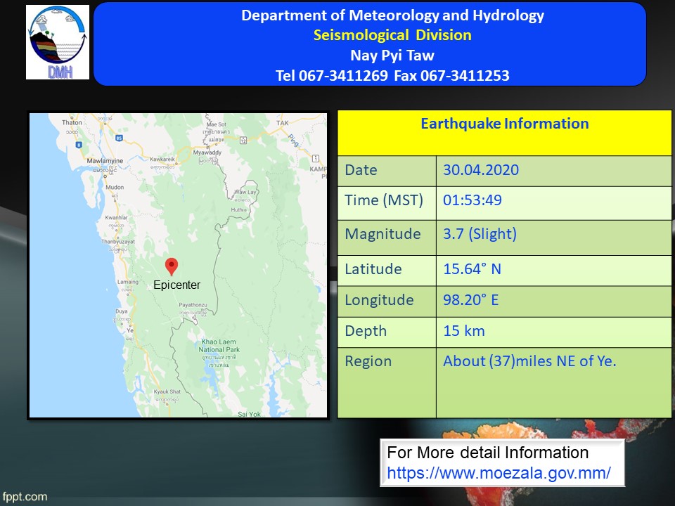 ယနေ့ နံနက် ၁ နာရီ ၅၃ မိနစ် ၄၉ စက္ကန့်တွင် မြဝတီမြေငလျင်စခန်းမှ အနောက်တောင်ဘက် (၇၄)မိုင် ခန့်ကွာဝေးသော မြန်မာနိုင်ငံပြည်တွင်း (ရေးမြို့၏ အရှေ့မြောက်ဘက် (၃၇)မိုင် ခန့်အကွာ) မြောက်လတ္တီတွဒ် (၁၅ ဒသမ ၆၄)ဒီဂရီ၊ အရှေ့လောင်ဂျီတွဒ် (၉၈ ဒသမ ၂၀)ဒီဂရီ၊ အနက် (၁၅)ကီလိုမီတာကို ဗဟိုပြု၍ အင်အား ရစ်(ခ်)တာစကေး (၃ ဒသမ ၇) အဆင့်ရှိ အင်အား အနည်းငယ်ရှိသော မြေငလျင်တစ်ခု လှုပ်ရှားသွားကြောင်း မိုးလေဝသနှင့် ဇလဗေဒညွှန်ကြားမှု ဦးစီးဌာန၏ ထုတ်ပြန်ချက်အရ သိရသည်။