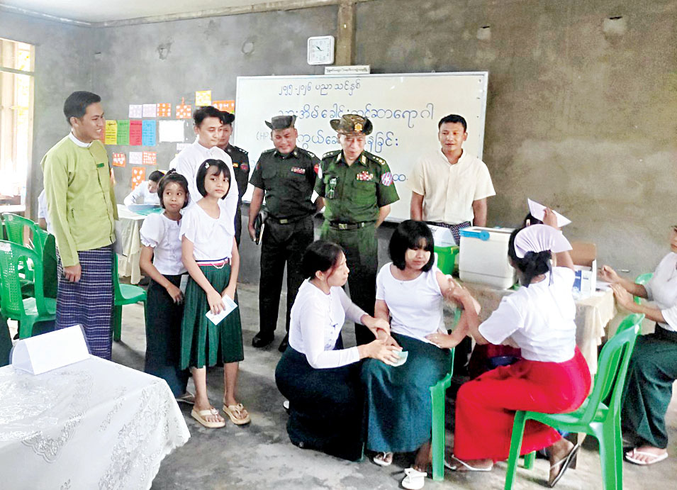 ထို့နောက် အသက် ကိုးနှစ်ပြည့်ပြီး ၁၀ နှစ်မကျော်သော ကျောင်းသူ Grade-3 မှ ၁၄ ဦးနှင့် Grade-4 မှ ၅၅ ဦးတို့အား သားအိမ်ခေါင်း ကင်ဆာရောဂါကာကွယ်ဆေး (HPV) ထိုးနှံပေးခြင်းနှင့် အသက် ငါးနှစ်ပြည့်ပြီး ခုနစ်နှစ်မကျော်သော KG ကျောင်းသား ကျောင်းသူ ၄၆ ဦးတို့အား ဆုံဆို့ မေးခိုင်ရောဂါ ကာကွယ်ဆေး(DT) ထိုးနှံပေးနေမှုကို တာဝန်ရှိသူများက လိုက်လံကြည့်ရှုပြီး အားပေးစကား ပြောကြားသည်။