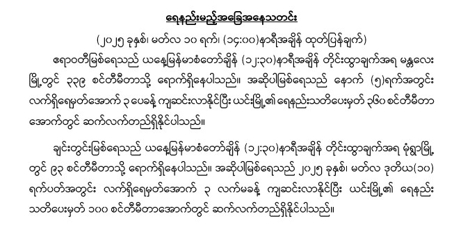 မိုးလေဝသနှင့်ဇလဗေဒညွှန်ကြားမှုဦးစီးဌာနမှ (၁၀-၃-၂၀၂၅) ရက်နေ့တွင် ရေနည်းမည့်အခြေအနေသတင်းကို ထုတ်ပြန်ထားပါတယ်…