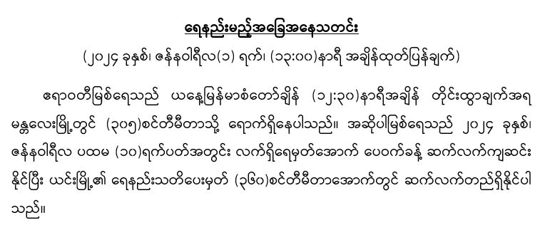 မိုးလေဝသနှင့်ဇလဗေဒညွှန်ကြားမှုဦးစီးဌာနမှ (၁.၁.၂၀၂၄) ရက်နေ့တွင် ရေနည်းမည့်အခြေအနေသတင်းကို အောက်ပါအတိုင်း ထုတ်ပြန်ထားပါတယ်…