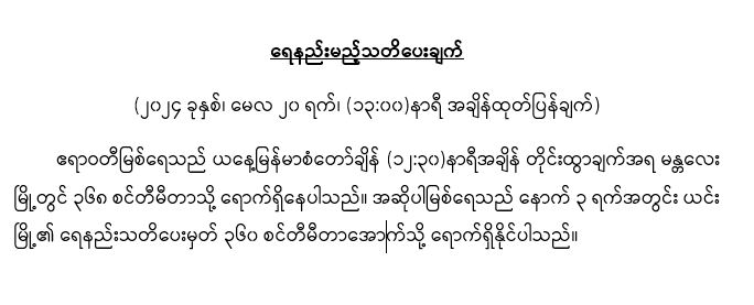 မိုးလေဝသနှင့်ဇလဗေဒညွှန်ကြားမှုဦးစီးဌာနမှ (၂၀.၅.၂၀၂၄) ရက်နေ့တွင် ရေနည်းမည့်သတိပေးချက်ကို အောက်ပါအတိုင်း ထုတ်ပြန်ထားပါတယ်…