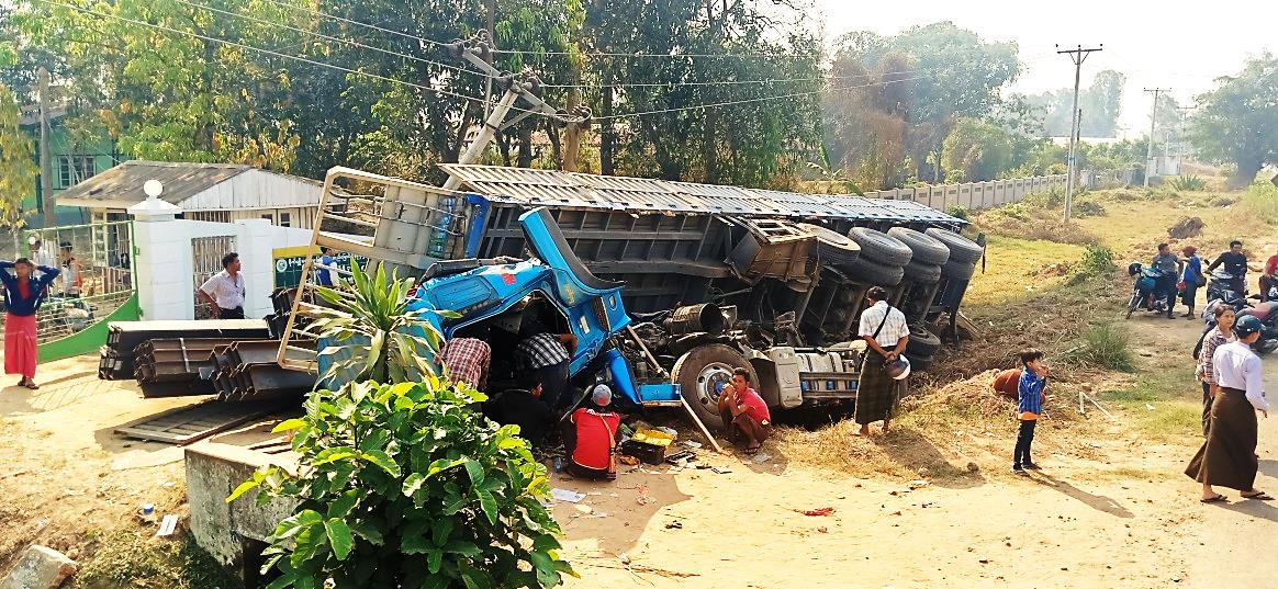 ပဲခူးတိုင်းဒေသကြီး၊ ရေတာရှည်မြို့ တောင်ဘက်အထွက် ရန်ကုန်-မန္တလေး ကားလမ်းတွင် မတ် ၁၀ ရက် နံနက် ၃ နာရီ မိနစ် ၂၀ ခန့်က သံဘောင်များ တင်ဆောင်လာသော ၂၂ ဘီးယာဉ် ယာဉ်မောင်းအိပ်ငိုက်ပြီး အရှိန်လွန်တိမ်းမှောက်မှု ဖြစ်ပွားခဲ့ကြောင်း သိရသည်။