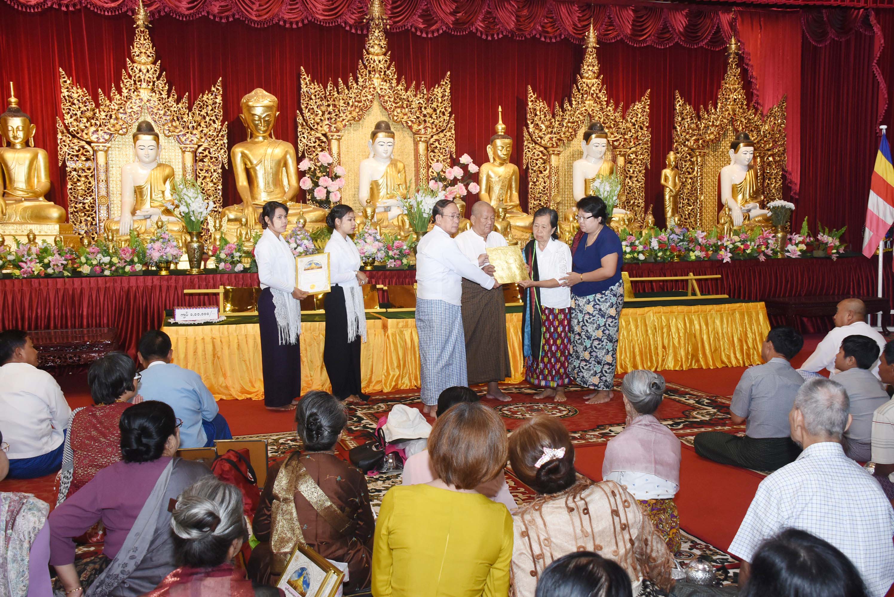 ရှေးဦးစွာ အလှူရှင်များက အလှူတော်ငွေများကို ပေးအပ်လှူဒါန်းရာ ဘဏ္ဍာ တော်ထိန်းဂေါပကအဖွဲ့ အလှည့်ကျသဘာပတိနှင့် ဘဏ္ဍာတော်ထိန်း ဂေါပကအဖွဲ့ ဝင်များက လက်ခံရယူပြီး ထုတိအနုမောဒနာဂုဏ်ပြုမှတ်တမ်းလွှာများ ပြန်လည်ပေး အပ်သည်။