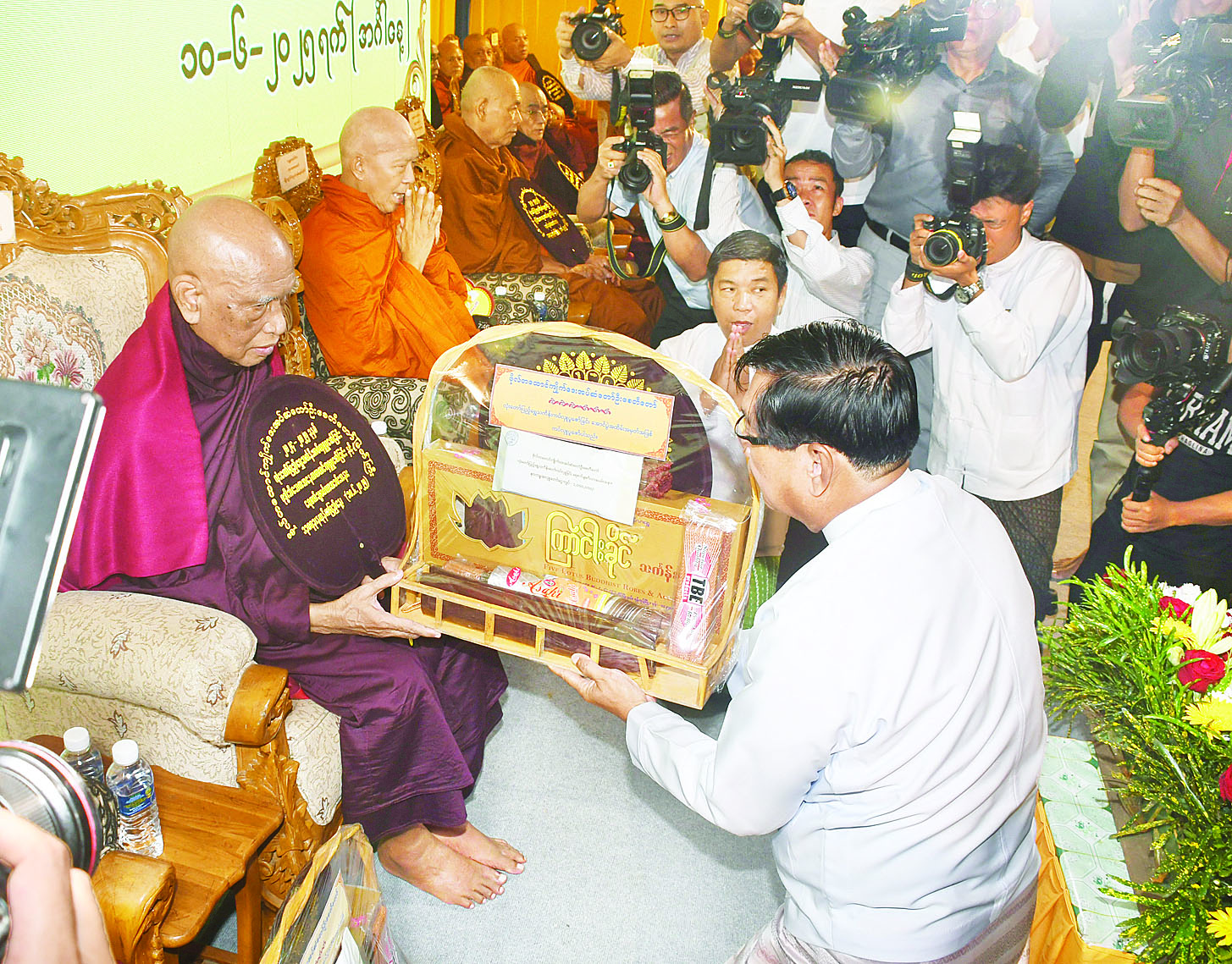 ဆက်လက်၍ တိုင်းဒေသကြီးဝန်ကြီးချုပ်က သာသနာရေးဆိုင်များကို လျှောက်ထားပြီး ဆရာတော်ကြီးများနှင့် ပင့်သံဃာတော်များအား တိုင်းဒေသကြီးဝန်ကြီးချုပ်၊ တိုင်းမှူး၊ တိုင်းဒေသကြီး ဝန်ကြီးများနှင့် အလှူရှင်များက လှူဖွယ်ပစ္စည်းများ ဆက်ကပ်လှူဒါန်းကြသည်။