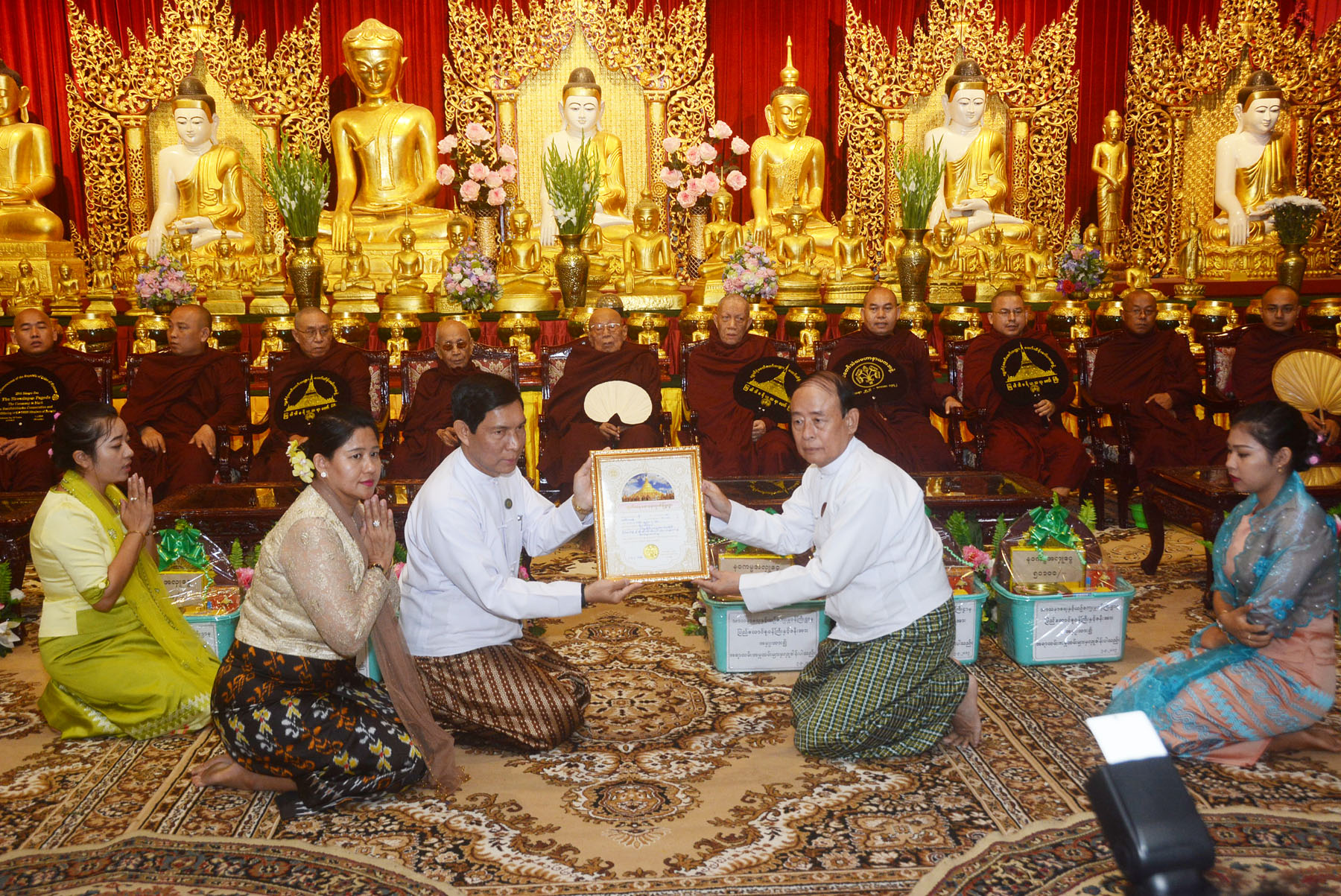ထို့နောက် ရွှေတိဂုံစေတီတော်မြတ်ကြီးအား ကပ်လှူပူဇော်မည့် သာသနာရေးနှင့် ယဉ်ကျေးမှုဝန်ကြီးဌာနက လှူဒါန်းသည့် ၆ ကျပ်သားရွှေပြားသင်္ကန်း ၃ ချပ်၊ စက်မှုဝန်ကြီးဌာနက လှူဒါန်းသည့် ၆ ကျပ်သားရွှေပြားသင်္ကန်း ၃ ချပ်တို့အား စက်မှုဝန်ကြီးဌာနမှ ပြည်ထောင်စုဝန်ကြီး ဦးခင်မောင်ချိုနှင့် ဇနီး၊ သာသနာရေးနှင့် ယဉ်ကျေးမှုဝန်ကြီးဌာန ပြည်ထောင်စုဝန်ကြီး၏ဇနီး၊ သာသနာရေးနှင့် ယဉ်ကျေးမှုဝန်ကြီးဌာန ဒုတိယဝန်ကြီးနှင့် တာဝန်ရှိသူများက ဂေါပကအဖွဲ့ အလှည့်ကျသဘာပတိ ဦးဝင်းနိုင်ထံ ပေးအပ်လှူဒါန်းပြီး ဂေါပကအဖွဲ့ အလှည့်ကျသဘာပတိက ဂုဏ်ပြုမှတ်တမ်းလွှာများ ပြန်လည်ပေးအပ်သည်။