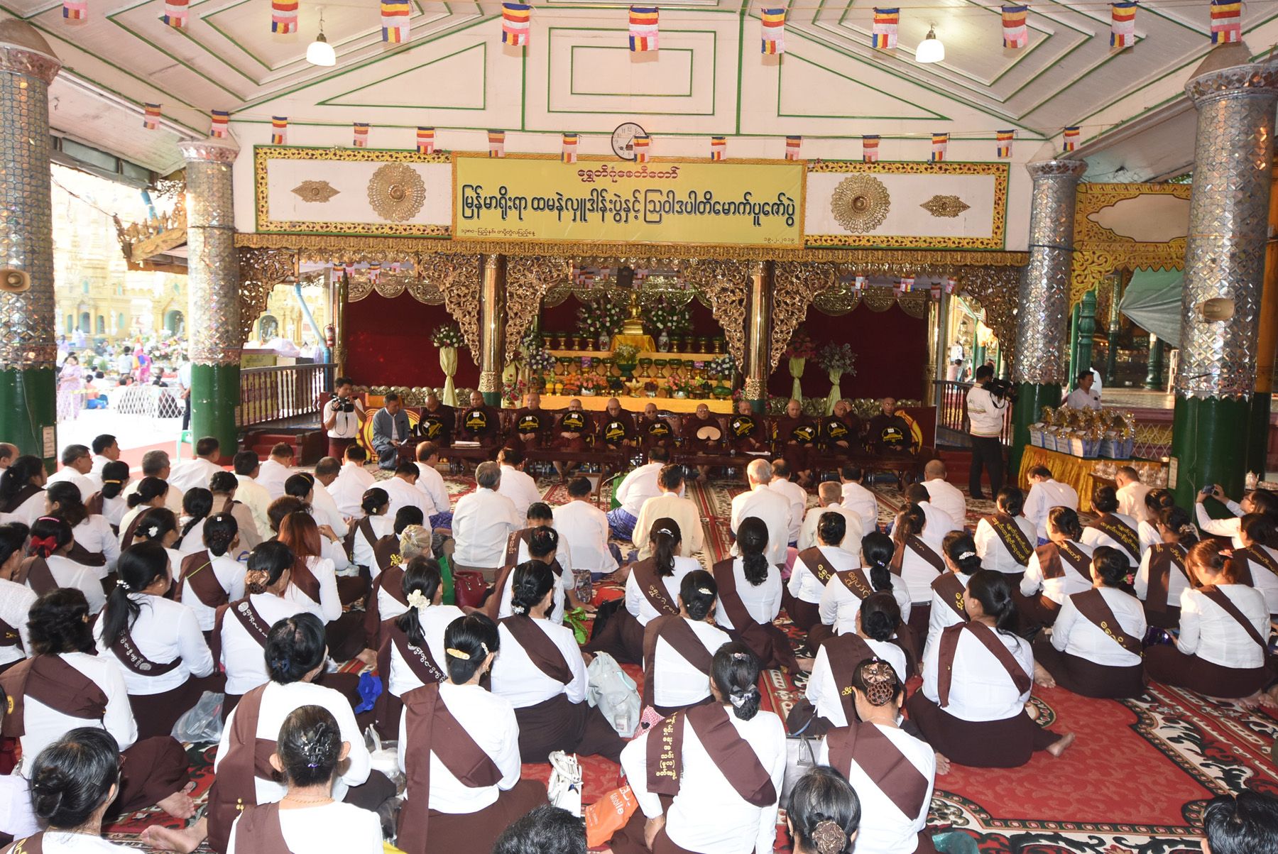 ထို့နောက် ရွှေတိဂုံစေတီတော် အလှည့်ကျ သဘာပတိ ဦးစိုးဝင်းက ဇေယျ မင်္ဂလာ အနုမောဒနာစကား လျှောက်ထားပြီး ဆရာတော် သံဃာတော်များ ရွတ်ပွား ပူဇော်သော ပရိတ်တရားတော်များ နာကြားကာ လှူဖွယ်ပစ္စည်းများ ဆက်ကပ်လှူဒါန်းသည်။