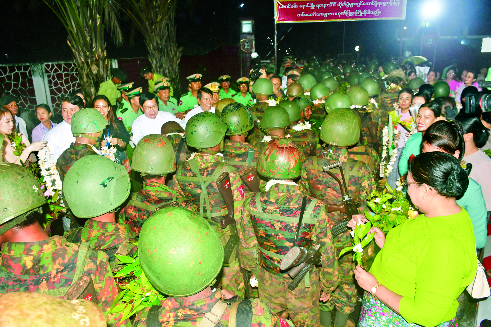 ထို့နောက် အောင်ပွဲရ ရှေ့တန်းပြန် တပ်မတော်သားများအား ဂုဏ်ပြုတွေ့ဆုံပွဲကို ဘားအံမြို့ နယ်မြေခံတပ်ခန်းမ၌ ပြုလုပ်ရာ ဒုတိယဗိုလ်ချုပ်ကြီး ညွန့်ဝင်းဆွေနှင့် ပြည်နယ်ဝန်ကြီးချုပ် ဦးစောမြင့်ဦးတို့က အောင်ပွဲရ ရှေ့တန်းပြန်တပ်မတော်သားများအား ဂုဏ်ပြုအမှာစကား ပြောကြားပြီး ဂုဏ်ပြုချီးမြှင့်ငွေများ ပေးအပ်ကြသည်။