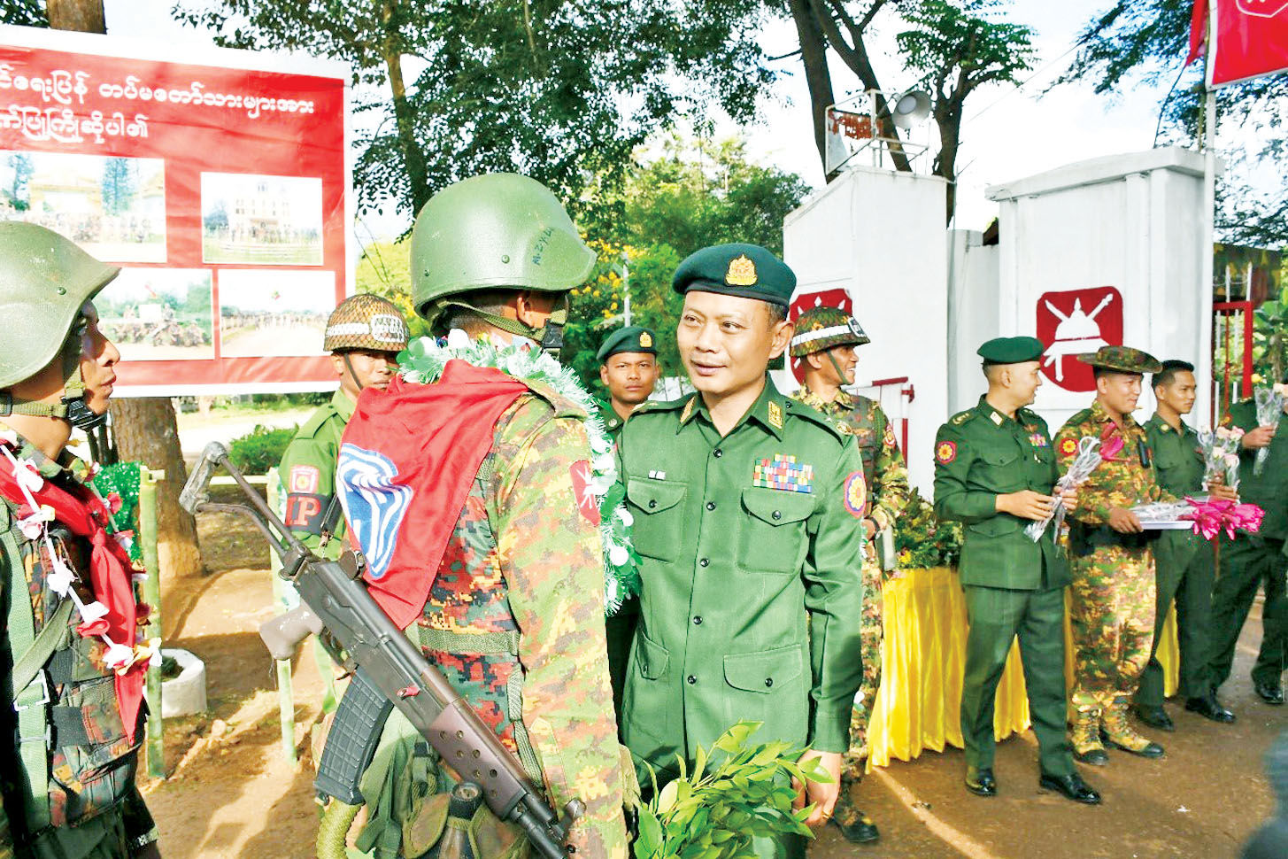 ရှေ့တန်းစစ်မျက်နှာများတွင် ရွပ်ရွပ်ချွံချွံ တိုက်ပွဲဝင်ပြီး အောင်ပွဲအလီလီရယူနိုင်ခဲ့သော အောင်ပွဲရ ရှေ့တန်းပြန် တပ်မတော်သားများအား ဂုဏ်ပြုကြိုဆိုခြင်းကို ယမန်နေ့ညနေပိုင်းတွင် မိုင်းပွန်မြို့ရှိ နယ်မြေခံတပ်၌ ပြုလုပ်ရာ အရှေ့အလယ်ပိုင်းတိုင်း စစ်ဌာနချုပ်တိုင်းမှူး ဗိုလ်ချုပ်စိုးမြတ်ထွဋ်နှင့် အဖွဲ့ဝင်များ၊ အရာရှိ၊ စစ်သည်၊ မိသားစုဝင်များ၊ ဌာနဆိုင်ရာတာဝန်ရှိသူများ၊ ဒေသခံတိုင်းရင်းသား ပြည်သူများနှင့် ဆရာ ဆရာမများ တက်ရောက်ကြသည်။