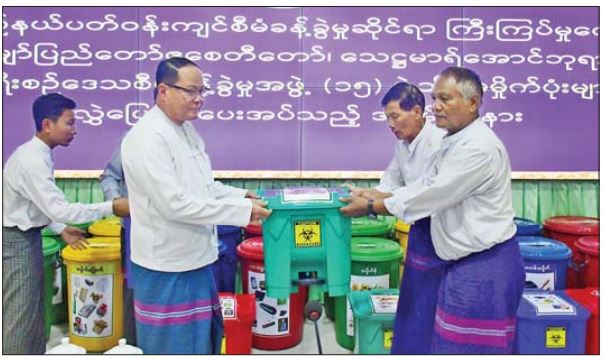 ကရင်ပြည်နယ်ပတ်ဝန်းကျင် စီမံခန့်ခွဲမှုဆိုင်ရာ ကြီးကြပ်မှု ကော်မတီအနေဖြင့် ခရီးစဉ်ဒေသ စီမံခန့်ခွဲမှု အဖွဲ့များသို့ အမှိုက်အိမ် ၁၃ လုံး၊ အမှိုက်ပုံးကြီး ၄၉ ပုံးနှင့် အမှိုက်ပုံး ၃၀ တို့ကို ဖြန့်ဝေပြီးစီးခဲ့ပြီး ယနေ့ အခမ်းအနားတွင် ပြည်နယ်ဝန်ကြီးချုပ်၊ အရှေ့တောင် တိုင်းစစ်ဌာနချုပ် ဒုတိယတိုင်းမှူး၊ ပြည်နယ် တရားလွှတ်တော်တရား သူကြီးချုပ်၊ ပြည်နယ်အစိုးရ အဖွဲ့ဝင်များနှင့် တာဝန်ရှိသူများက အမှိုက်စို၊ အမှိုက်ခြောက်၊ ပလတ်စတစ်နှင့် ဘေးအန္တရာယ်ရှိအမှိုက်ဟူ၍ အမှိုက်ခွဲခြား စွန့်ပစ်နိုင်ရန် ရွှေယဉ်မျှော်ပြည်တော်ဧစေတီ တော်၊ သေဋ္ဌမာရ်အောင်ဘုရားကြီးအောင်နှင့် ခရီးစဉ်ဒေသစီမံခန့်ခွဲမှု အဖွဲ့ ၁၅ ဖွဲ့သို့ အမှိုက်ပုံး လေးပုံးစီ စုစုပေါင်းငွေကျပ် သုံးဆယ်ခြောက်သိန်းနှစ်သောင်း တန်ဖိုးရှိ အမှိုက်ပုံး ၆၈ ပုံးကို လွှဲပြောင်းပေးအပ်သည်။