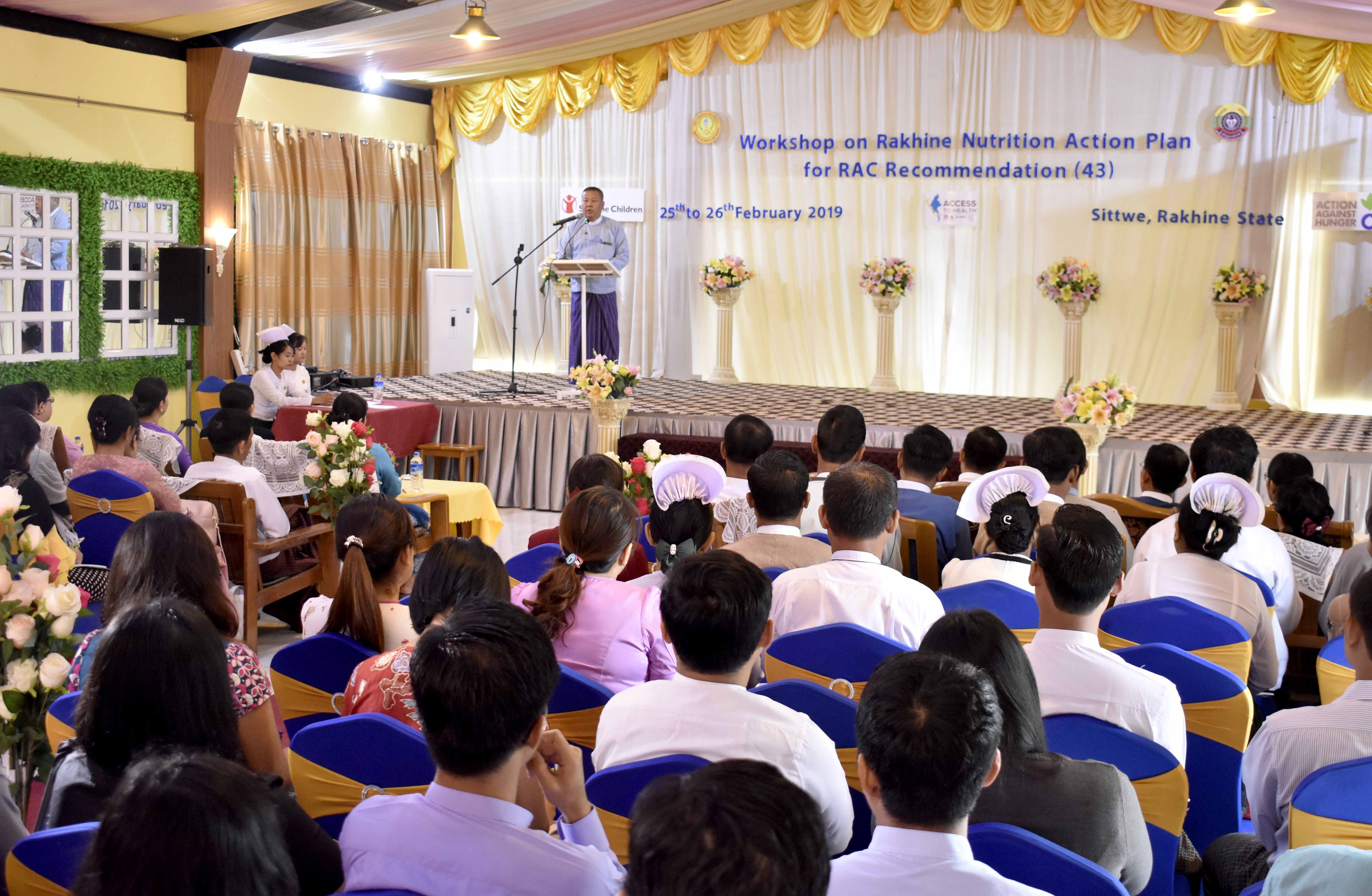 အလုပ်ရုံ ဆွေးနွေးပွဲ ဖွင့်ပွဲ အခမ်းအနားတွင် ပြည်နယ်လူမှုရေးဝန်ကြီး ဒေါက်တာ ချမ်းသာက ခေတ်မီဖွံ့ဖြိုး တိုးတက်သည့် လူ့အဖွဲ့အစည်း တစ်ရပ် တည်ဆောက်ဖို့အတွက် အာဟာရသည် အရေးကြီးသည့် အခြေခံ အုတ်မြစ်ဖြစ်ကြောင်း၊ ကျန်းမာရေးသည် အရေးကြီးပါကြောင်း၊ ကျန်းမာရေးဆိုသည့်နေရာတွင် အာဟာရ ပြည့်ဝသည့် လူမျိုးများ ဖြစ်ရန်လိုကြောင်း၊ လူမျိုးတစ်မျိုးသည် အာဟာရပြည့်ဝမှ တခြားလူမျိုးများနှင့် ယှဉ်နိုင်ပြီး နိုင်ငံတကာမှာ ယဉ်ပေါင်တန်းနိုင်မှာဖြစ်ကြောင်း၊ ရခိုင်ပြည်နယ်သည် စားနပ်ရိက္ခာပြည့်စုံသည့် ပြည်နယ်တစ်ခု ဖြစ်သော်လည်း မြန်မာနိုင်ငံ အဏုအာဟာရနှင့် အစာစားသုံးမှု လေ့လာရေးစစ်တမ်း ကနဦးရလဒ် ထုတ်ပြန်ချက်အရ အိုင်အိုဒင်း ချို့တဲ့မှုနှင့် သံဓာတ်ချို့တဲ့ သွေးအားနည်းရောဂါ ဖြစ်ပွားမှုနှုန်းများသည် တစ်နိုင်ငံလုံးတွင် အမြင့်မား ဆုံး ဖြစ်နေသည်ကို တွေ့ရပါကြောင်း၊ ထို့ကြောင့် ရခိုင်ပြည်နယ် အနေဖြင့် ဘက်စုံပြည့်ဝသည့် ကဏ္ဍပေါင်းစုံပါဝင်သော အာဟာဖွံ့ဖြိုးရေး စီမံချက်တစ်ခု မဖြစ်မနေ လိုအပ်လာပါကြောင်း၊ ယခု ကျင်းပသည့် ဆွေးနွေးပွဲသည် အရေးအကြီးဆုံးဟု မြင်ပါကြောင်း၊ ရခိုင်ပြည်နယ်ဆိုင်ရာ အကြံပေး ကော်မရှင်၏ အကြံပြုချက်(၄၃)မှာလည်း အစိုးရ အနေဖြင့် အာဟာရချို့တဲ့မှု ပြဿနာကို ဖြေရှင်းသွားနိုင်ရန် တပြည်နယ်လုံးအတွက် ဘက်စုံပြည့်စုံသော စီမံချက် တစ်ခုကို ဖော်ဆောင် သွားသင်ပါတယ် ဟုပါရှိပါကြောင်း၊ ယခုဆွေးနွေးပွဲသည် ၎င်းအကြံပြုချက်ကို အကောင်အထည် ဖော်ပြီးသား ဖြစ်မည်ဟု မြင်ပါကြောင်း၊ ထို့ကြောင့် ယနေ့ဆွေးနွေးပွဲမှ အတွေ့အကြုံများ၊ ရလဒ်များ၊ အကြုံချက်များကို အခြေခံပြီး ရခိုင်ပြည်နယ်အတွက် အာဟာရ ဖွံ့ဖြိုးရေး စီမံကိန်းကို ကဏ္ဍပေါင်းစုံက ပါဝင်ညှိနှိုင်း ဆွေးနွေးကာ ပြည်နယ်၏ အနာဂတ်ကောင်းမွန်ရန်ရည်မှန်း၍ အာဟာရနှင့် သက်ဆိုင်သော လိုအပ်ချက်များကို အောင်မြင်စွာ အကောင်အထည်ဖော် လက်တွဲဆောင်ရွက် သွားကြရန် ပြောကြားသည်။