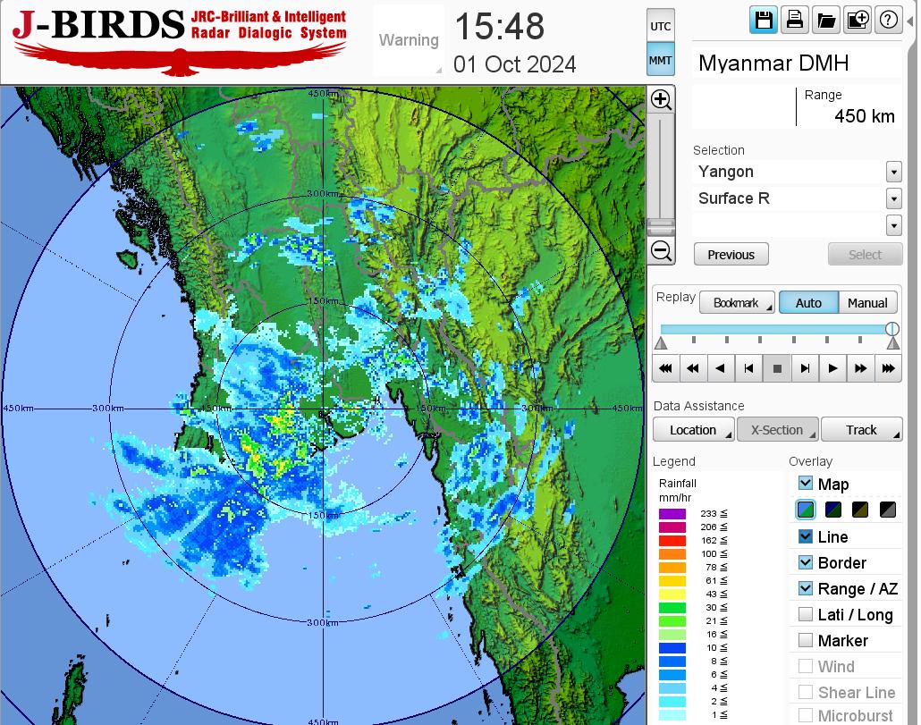 မိုးတိမ်တောင်ဖြစ်ပေါ်မှုအခြေအနေ။ နေပြည်တော်၊ စစ်ကိုင်းတိုင်းဒေသကြီး၊ မန္တလေးတိုင်းဒေသကြီး၊ မကွေးတိုင်းဒေသကြီး၊ ပဲခူးတိုင်းဒေသကြီး၊ ရန်ကုန်တိုင်းဒေသကြီး၊ ဧရာဝတီတိုင်းဒေသကြီး၊ တနင်္သာရီတိုင်းဒေသကြီး၊ ကချင်ပြည်နယ်၊ ရှမ်းပြည်နယ်(မြောက်ပိုင်းနှင့် တောင်ပိုင်း)၊ ချင်းပြည်နယ်၊ ရခိုင်ပြည်နယ်၊ ကယားပြည်နယ်၊ ကရင်ပြည်နယ်နှင့် မွန်ပြည်နယ်တို့တွင် မိုးတိမ်တောင်များ ဖြစ်ထွန်းလျက်ရှိပြီး၊ အဆိုပါ မိုးတိမ်တောင်များရွေ့လျားရာ နေရာတစ်လျှောက်တွင် မိုးရွာသွန်းခြင်းနှင့်အတူ လေပြင်းတိုက်ခတ်ခြင်း၊ မိုးထစ်ချုန်းခြင်း၊ မိုးကြိုးပစ်ခြင်း၊ လျှပ်စီးလက်ခြင်းနှင့် မိုးသီးကြွေခြင်းစသည့် မိုးလေဝသဖြစ်စဉ်များ ဖြစ်ပေါ်နိုင်ပါသဖြင့့်် ကြိုတင်သတိပြုနိုင်ပါရန် အကြံပြုအပ်ပါသည်။