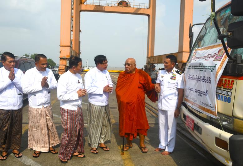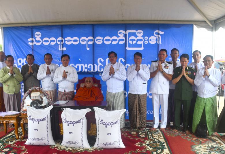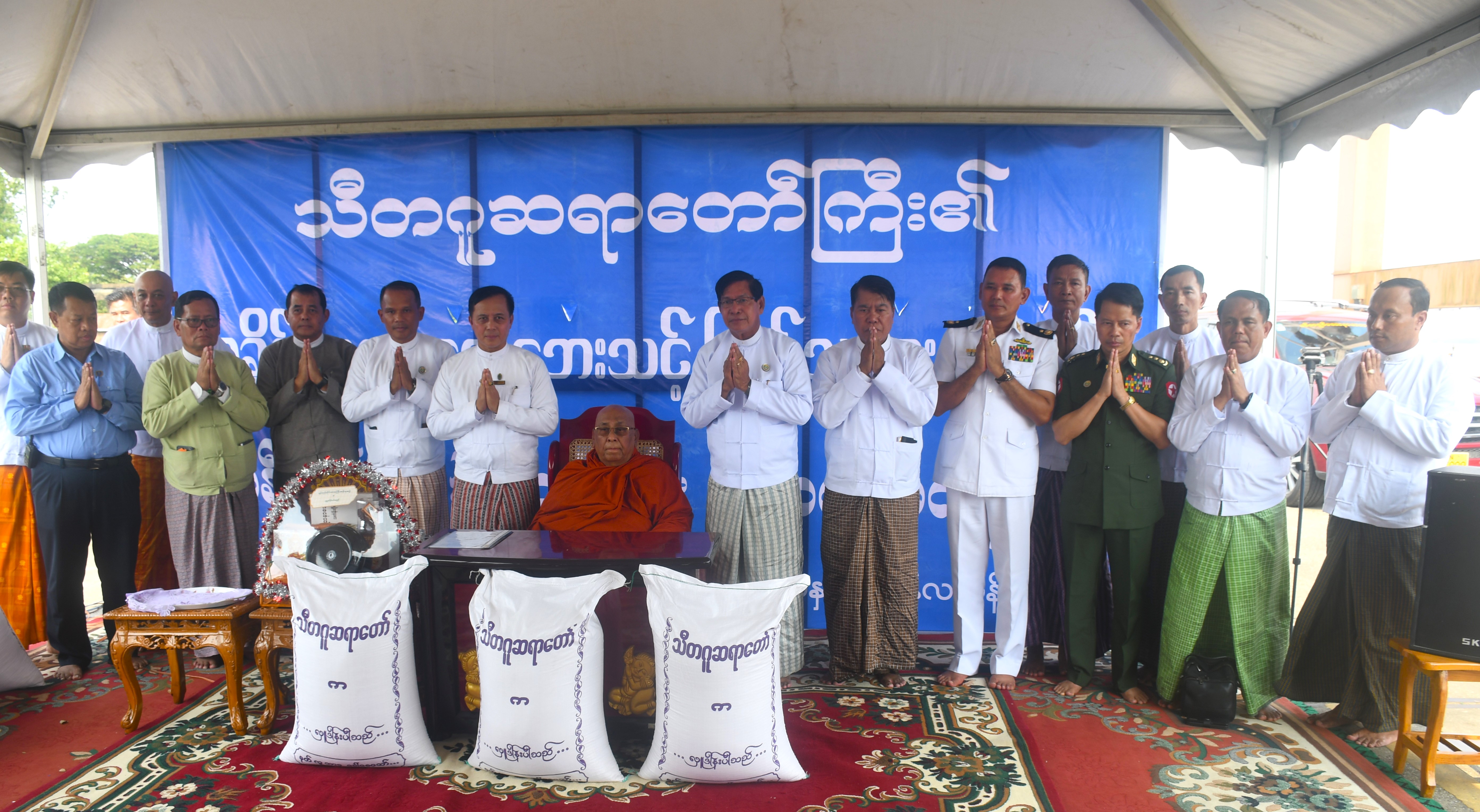 ထို့နောက် ဆရာတော်ကြီးက တစ်တင်းခွဲဝင် ဆန်အိတ် ၁၀၀၀ ကို တိုင်းဒေသကြီး ဝန်ကြီးချုပ်၊ ဒုတိယဝန်ကြီးနှင့် အလယ်ပိုင်းရေတပ်ကွပ်ကဲမှု ဌာနချုပ်မှူးတို့မှတစ်ဆင့် မုန်တိုင်းဒဏ်သင့်ဒေသများရှိ ပြည်သူများထံ ဆက်လက်ပေးပို့နိုင်ရေး လွှဲပြောင်းပေးအပ်လှူဒါန်းသည်။ ဆက်လက်၍ တိုင်းဒေသကြီးဝန်ကြီးချုပ်၊ ဒုတိယဝန်ကြီးနှင့် အလယ်ပိုင်းရေတပ်ကွပ်ကဲမှု ဌာနချုပ်မှူးတို့က သီတဂူဆရာတော်ကြီးထံ လှူဖွယ်ပစ္စည်းများနှင့် နဝကမ္မအလှူငွေများ ပေးအပ်လှူဒါန်းပြီး သီတဂူဆရာတော်ကြီးက ဆန်အိတ်များအား ရခိုင်ပြည်နယ် လေဘေးသင့်ပြည်သူများထံ သွားရောက်ထောက်ပံ့မည့် MV - ရတနာမင်း ထောက်ပံ့ပို့ဆောင်ရေးရေယာဉ်ပေါ်သို့ တင်ဆောင်နေမှုကိုကြည့်ရှုသည်။