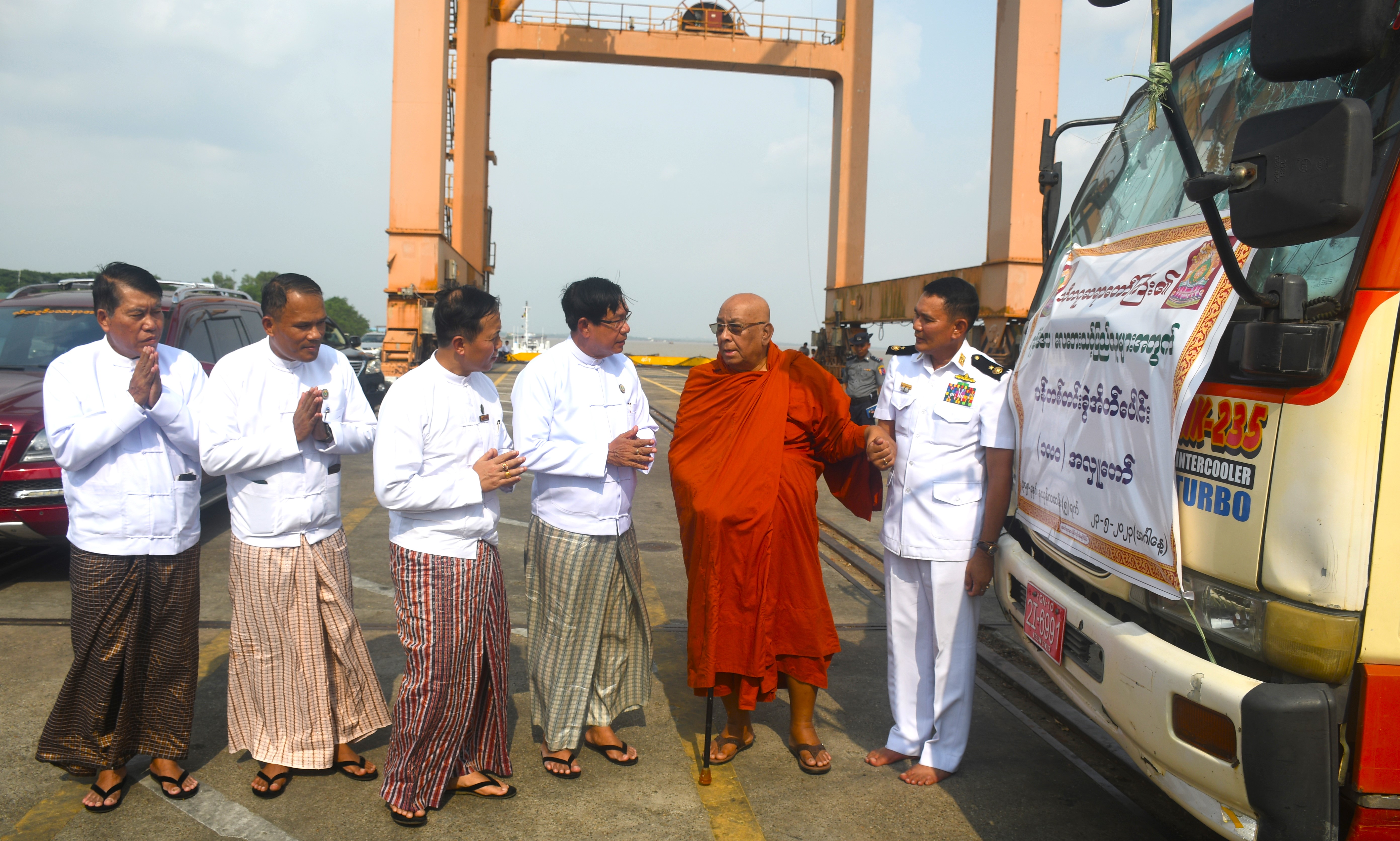 ယင်းနောက် တိုင်းဒေသကြီးဝန်ကြီး ချုပ်နှင့်အဖွဲ့သည် MV - ရတနာမင်းပေါ်သို့ တာဝါတိုင် တန် ၃၀၊ ရိက္ခာခြောက် ၁၅၀၀ ထုပ်အားလည်းကောင်း၊ စစ်ရေယာဉ်ပြည်တော်အေး (၃)သင်္ဘောပေါ်သို့ သွပ်နှင့်ဆန်အိတ်များ တင်ဆောင်နေမှုကိုလည်း ကောင်း၊ MCL - 5 သင်္ဘောပေါ်သို့ သစ်ဆိုက်စုံ ၂၀၉ တန်၊ ဆန် ၂၄ ပြည် အိတ် ၃၉၀၀၀၊ ကရိန်းကား သုံးစီး၊ သွပ် ၁၁၃၀၃၀ ချပ်၊ ဒီဇယ် သုံးပေပါ၊ အိမ်ရိုက်သံ ၅ ဒဿမ ၇ တန်၊ မိုးကာတဲ ၂၅၄ လုံး တင်ဆောင်နေမှုကိုလည်းကောင်း၊ လျှပ်စစ်မီးတိုင်များအား သင်္ဘောပေါ်သို့ တင်ဆောင်ရန် စောင့်ဆိုင်းနေသည့်ကားများကို လည်းကောင်း ကြည့်ရှုစစ်ဆေး၍ လိုအပ်သည်များကို ပေါင်းစပ်ညှိနှိုင်းဆောင်ရွက်ပေးသည်။